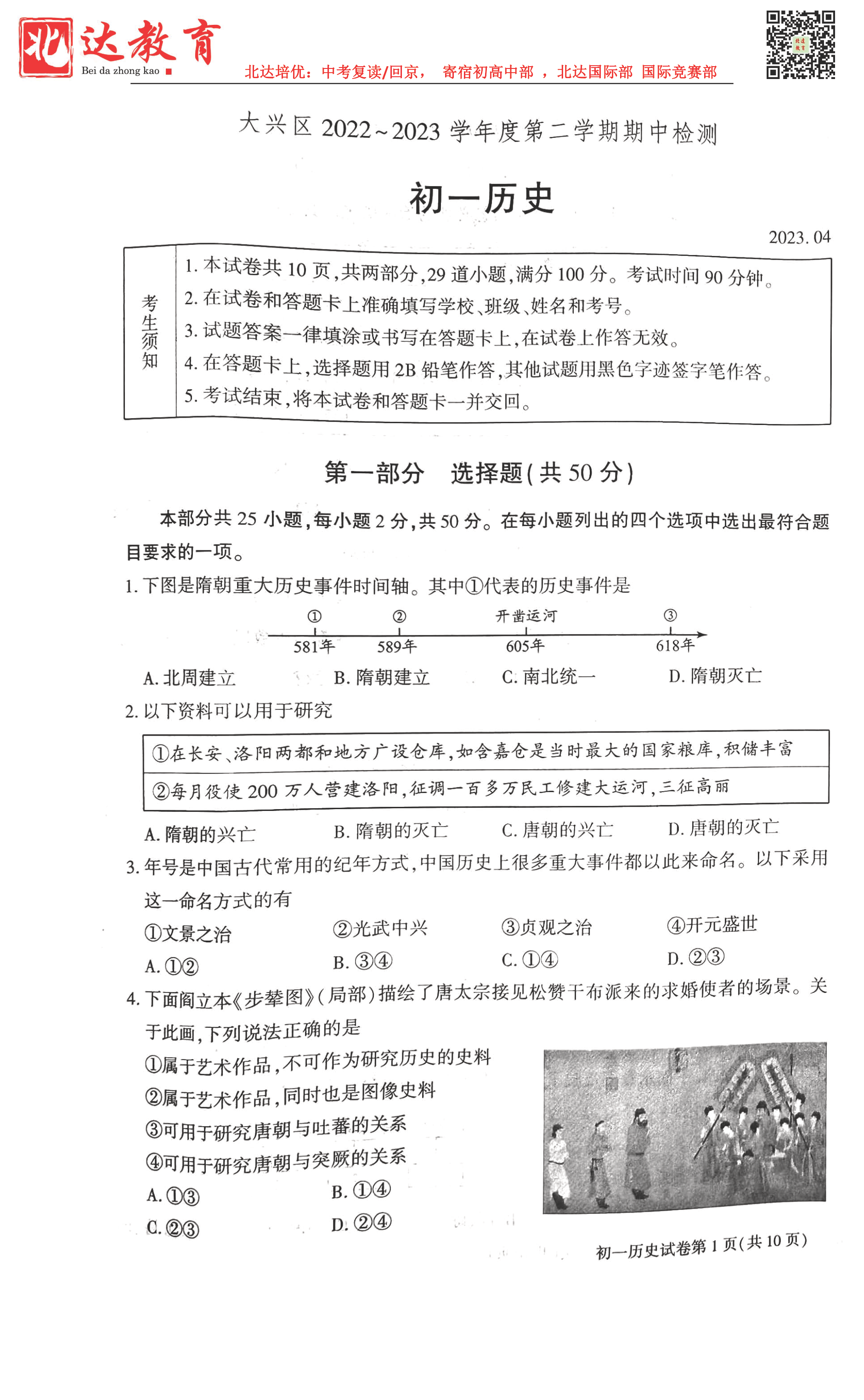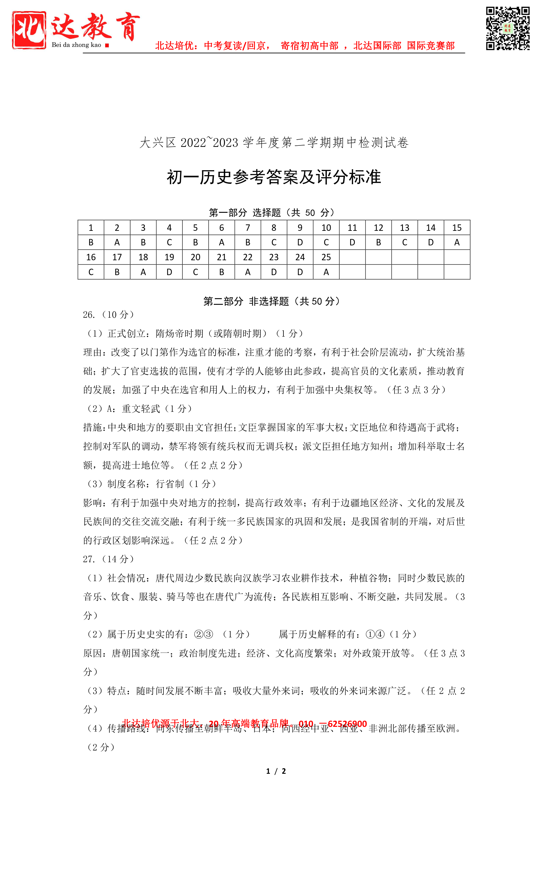 2023学年大兴初一历史期中考考试已结束,admw360中考网为大家整理了试题及答案,分享给大家。
