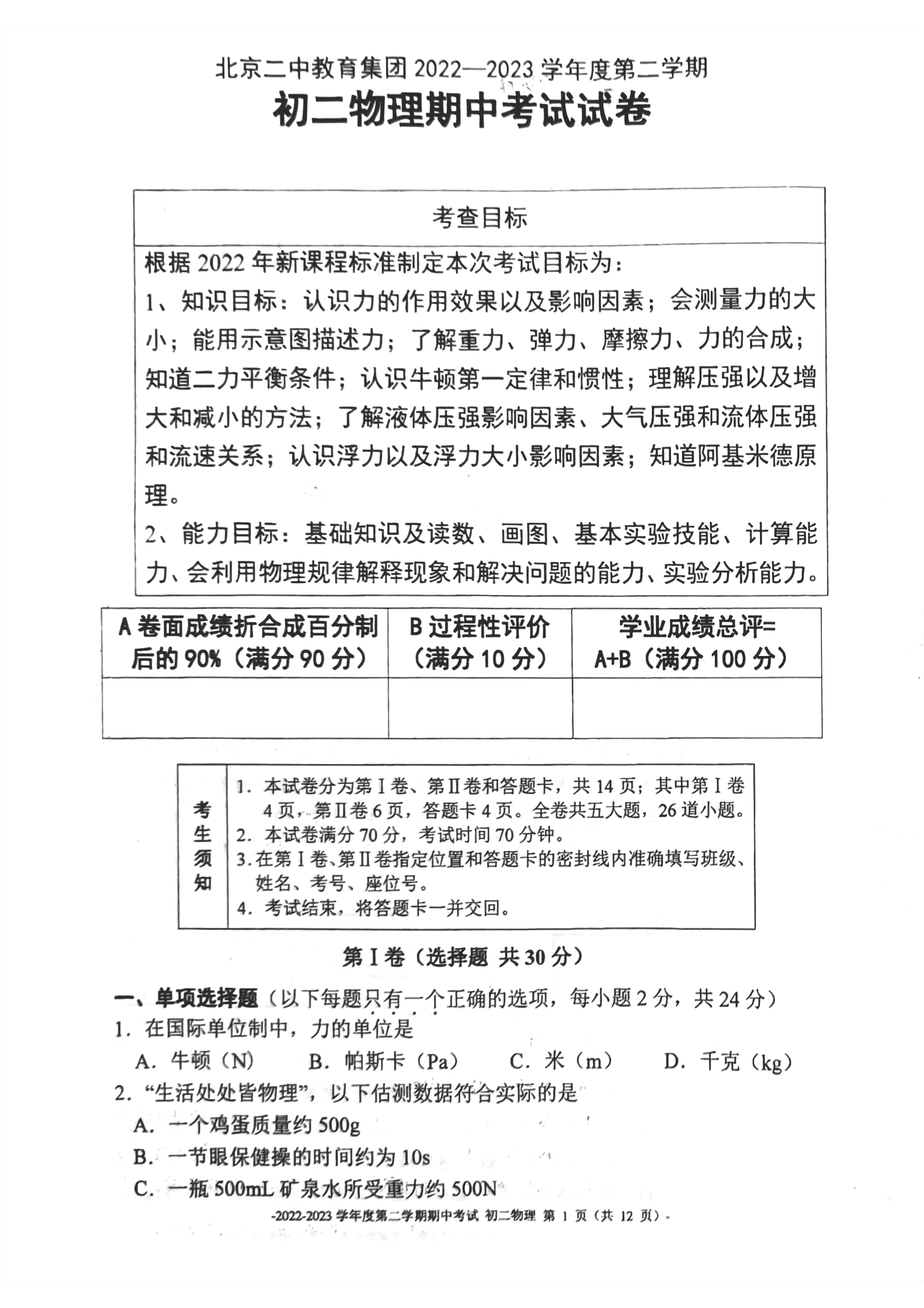 2023北京二中初二下物理期中考已结束,admw360中考网为大家整理了 试题及答案,分享给大家。 相关阅读:2023北京各区初二(下)期中试题及答案汇总 2023北京各区初二下期中试卷&a…