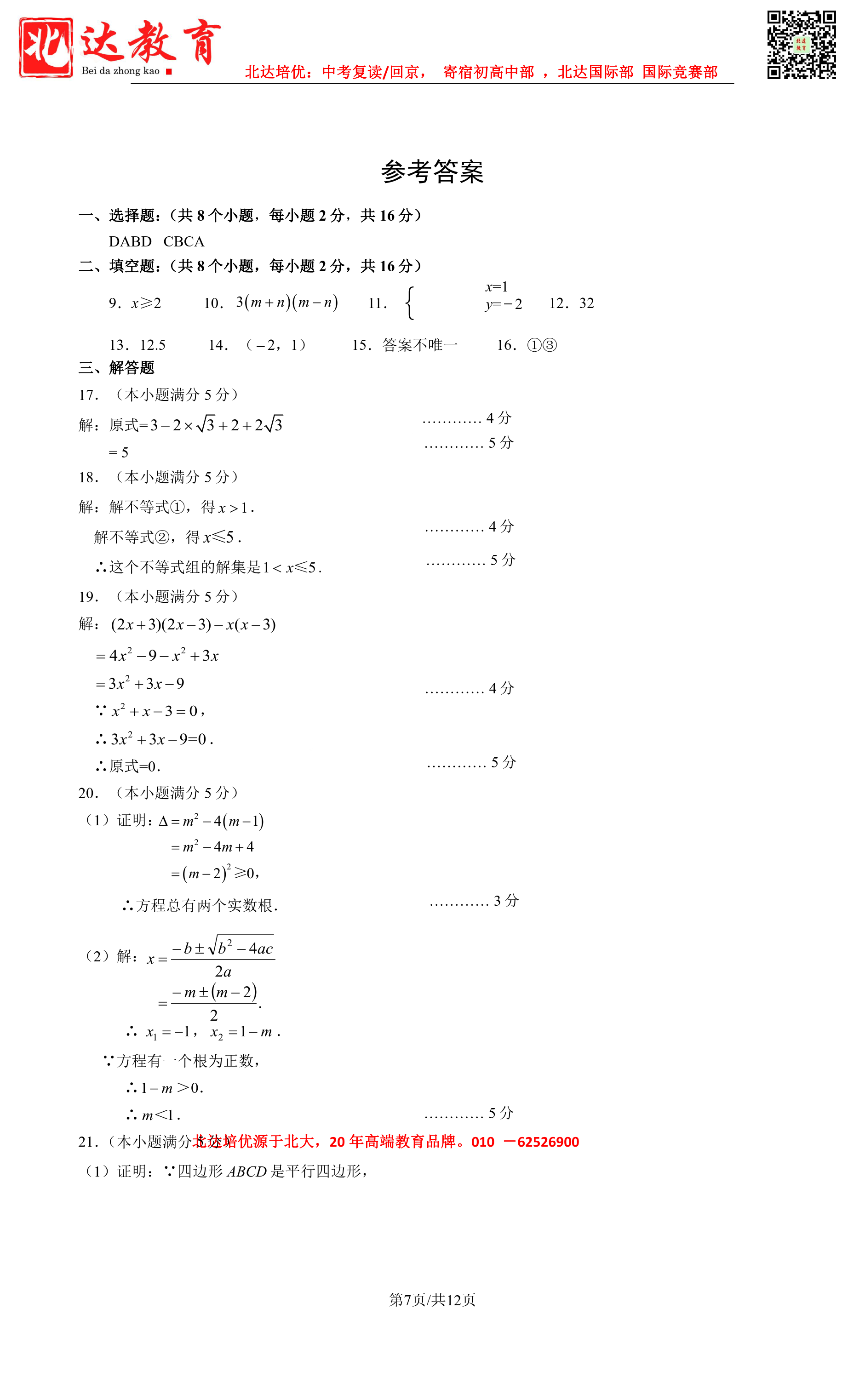 admw360中考网为大家整理了2023北京延庆区初三一模数学试题及答案,分享给大家。