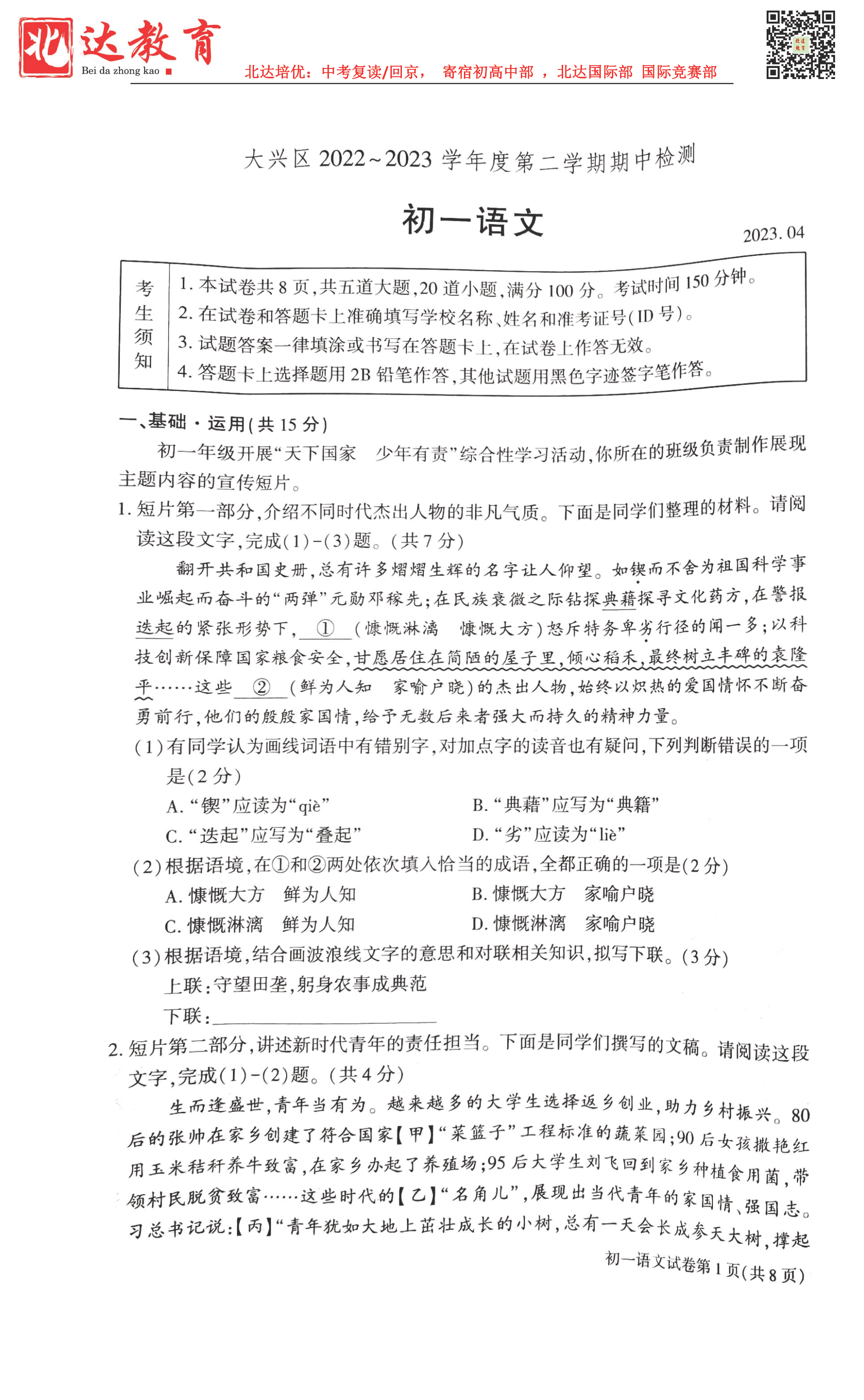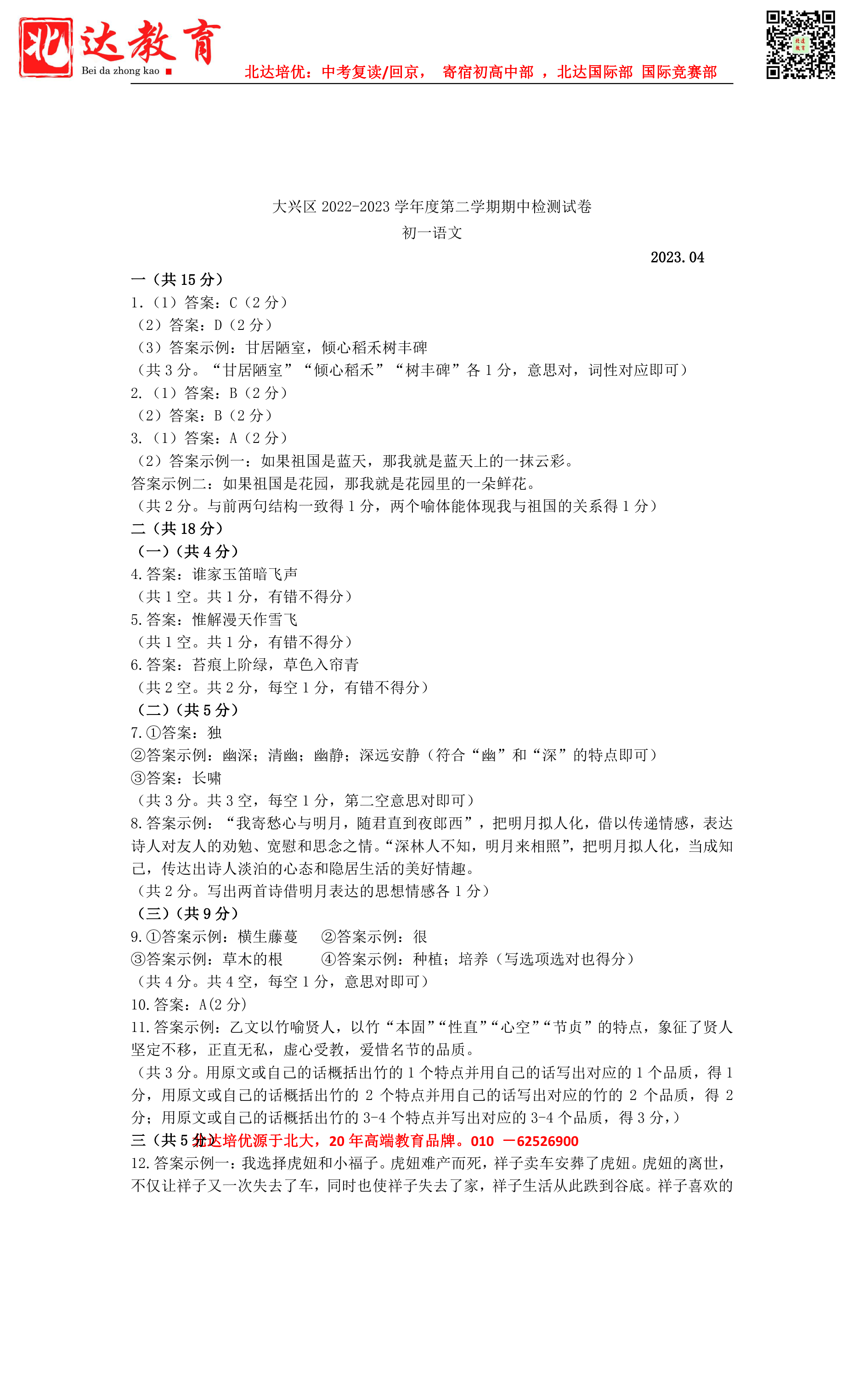 2023学年北京大兴区初一语文期中考考试已结束,admw360中考网为大家整理了试题及答案,分享给大家。