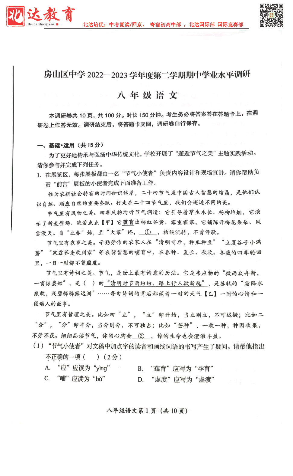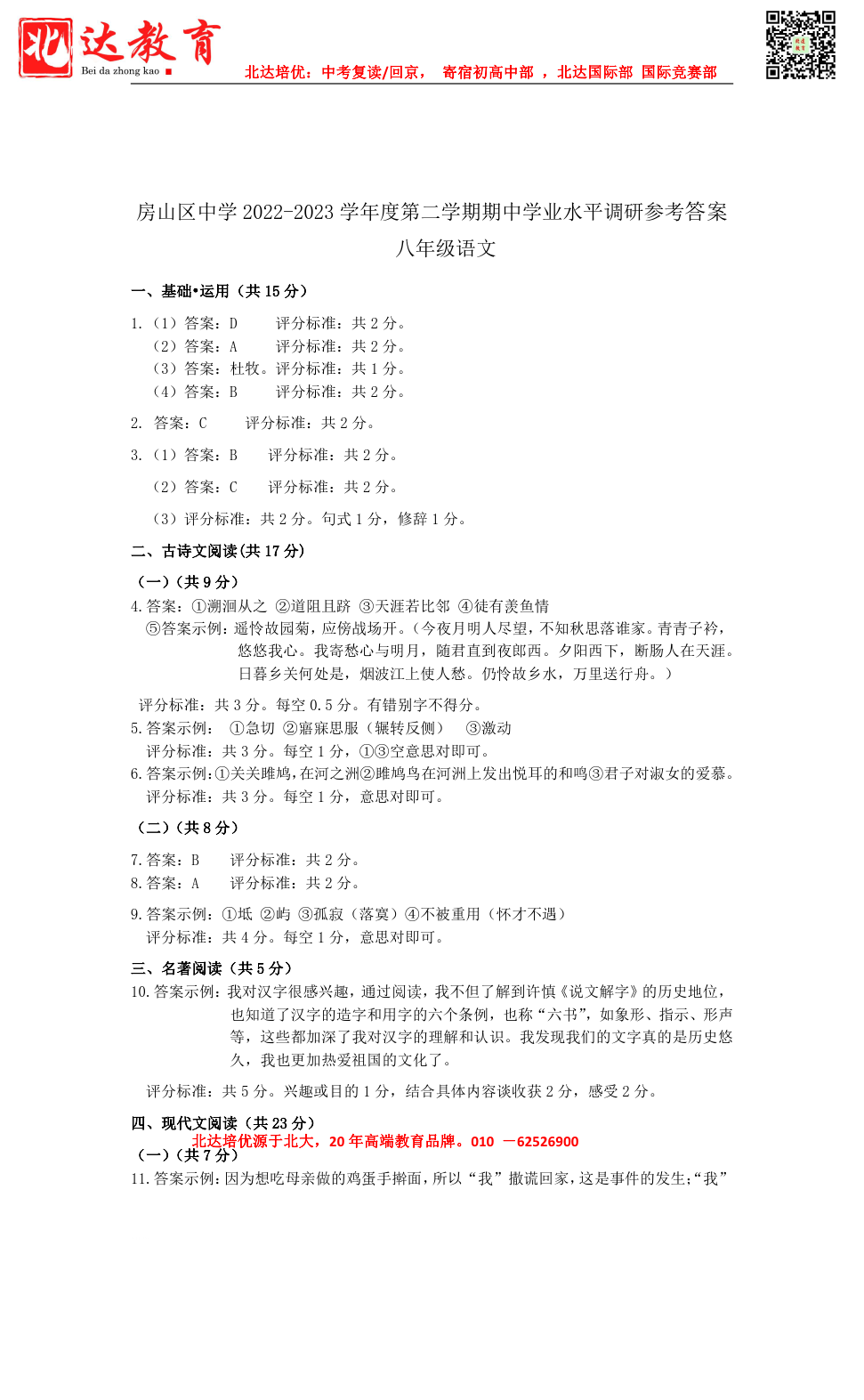 2023北京房山区初二下语文期中考已结束,admw360中考网为大家整理了 试题及答案,分享给大家。