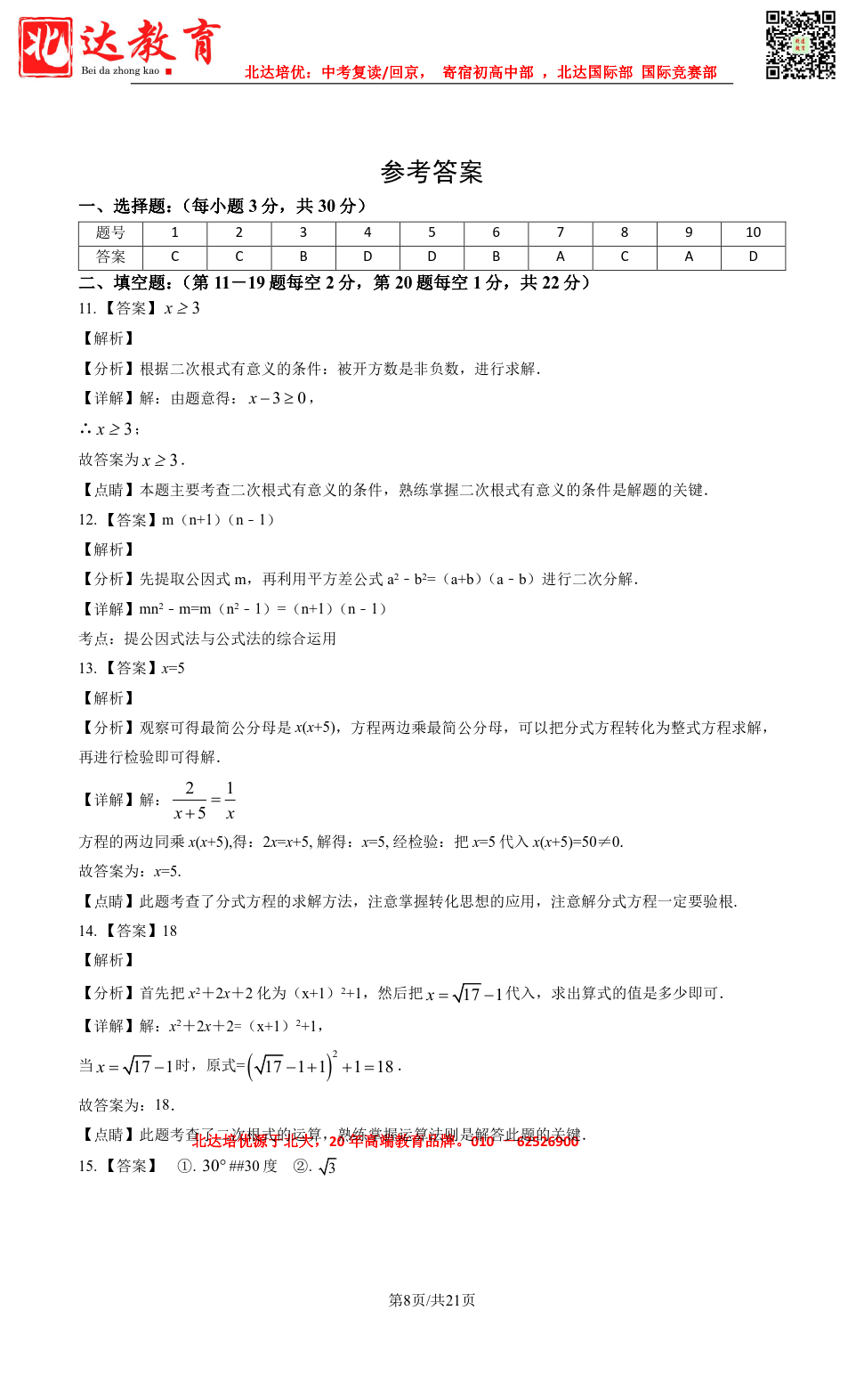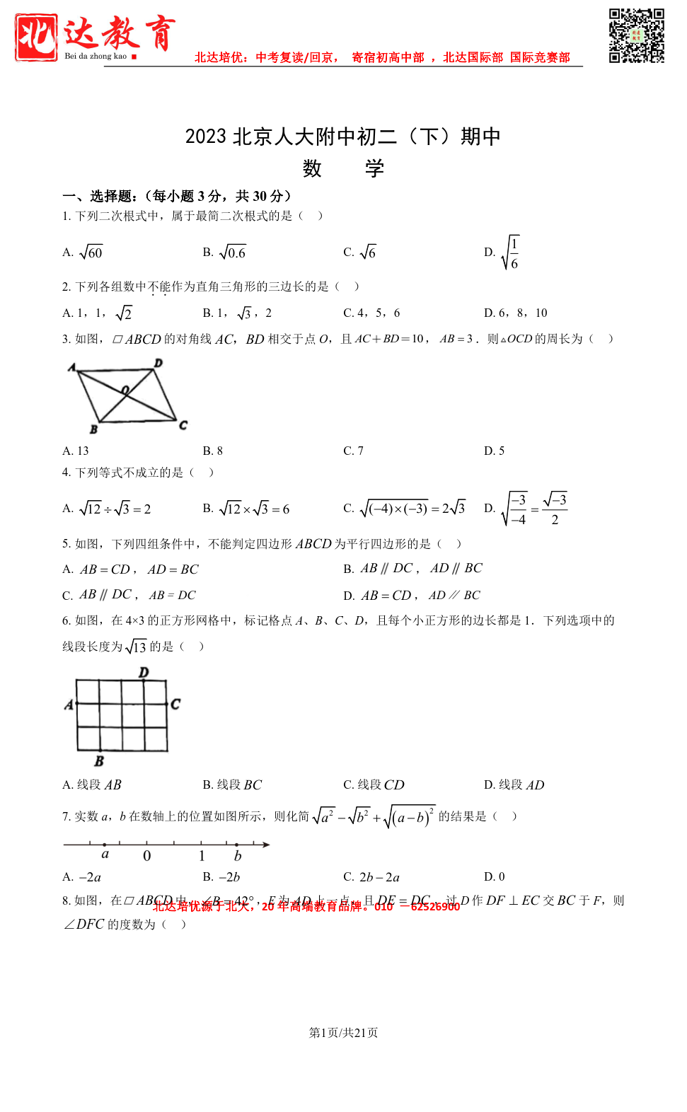 2023北京人大附中初二下数学期中考已结束,admw360中考网为大家整理了 试题及答案,分享给大家。
