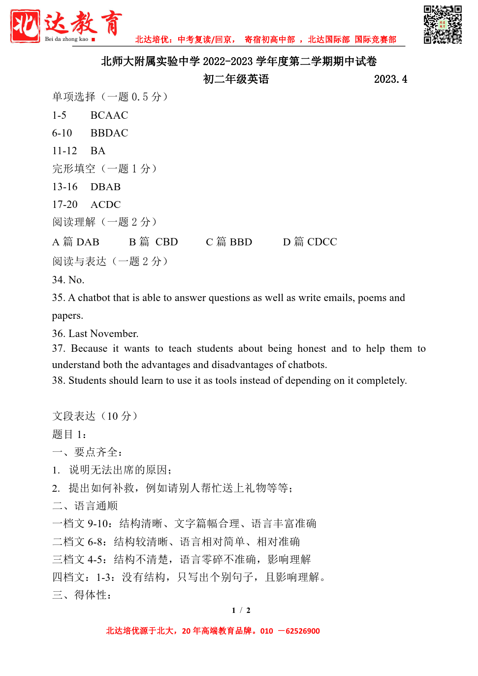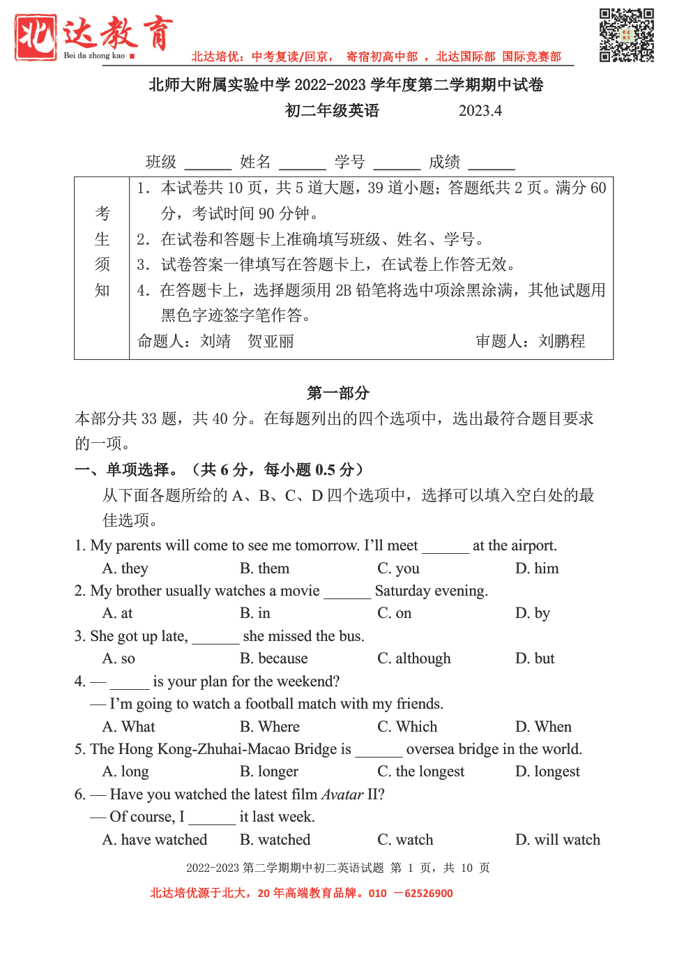 2023北京北师大实验中学初二下英语期中考已结束,admw360中考网为大家整理了 试题及答案,分享给大家。
