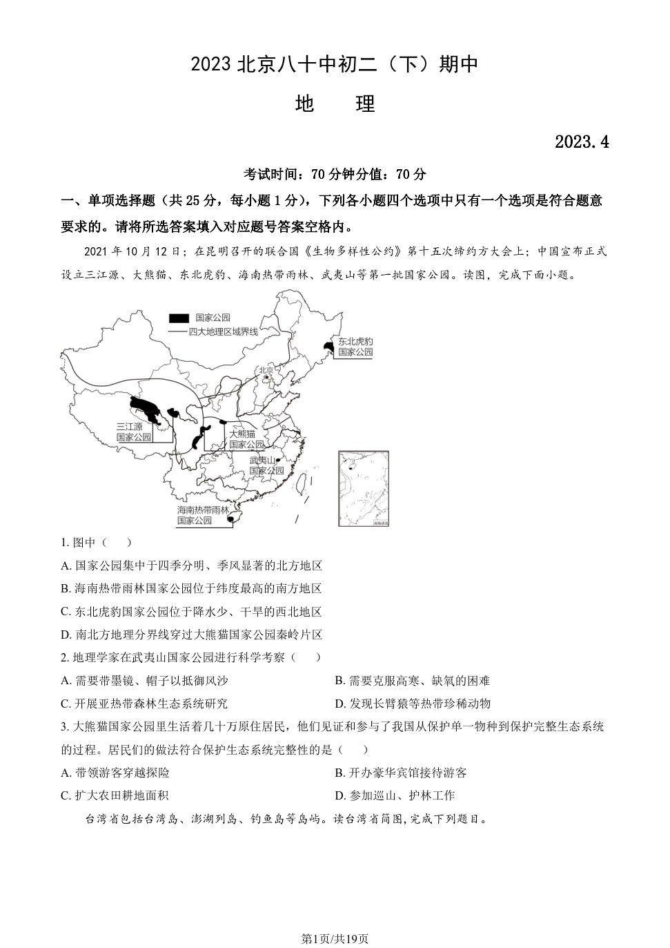 2023北京八十中初二下地理期中考已结束,admw360中考网为大家整理了 试题及答案,分享给大家。