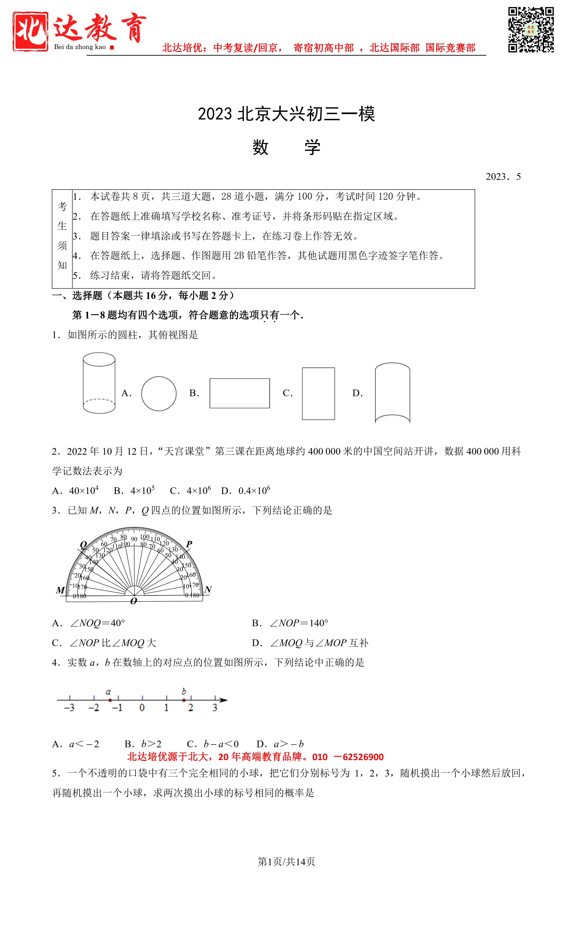 admw360中考网为大家整理了2023北京大兴区初三一模数学试题及答案,分享给大家。