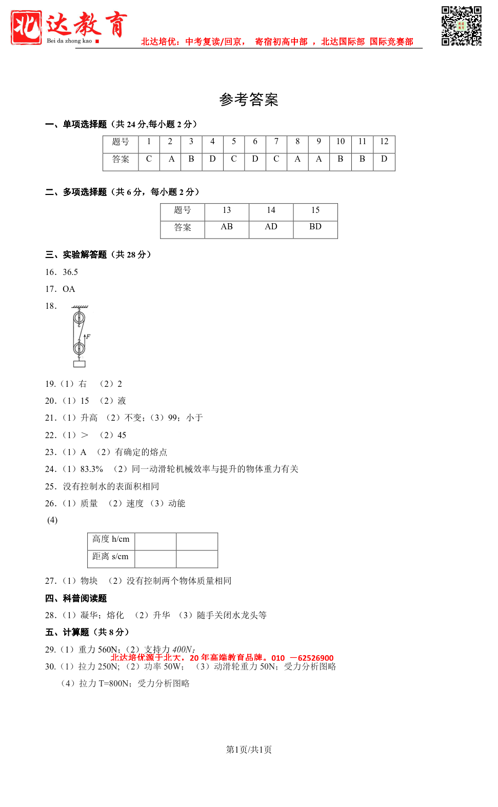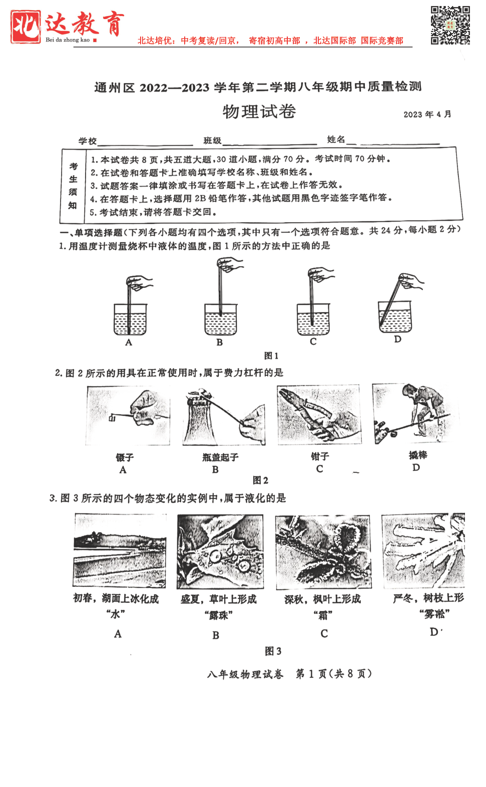 2023北京通州区初二下物理期中考已结束,admw360中考网为大家整理了 试题及答案,分享给大家。
