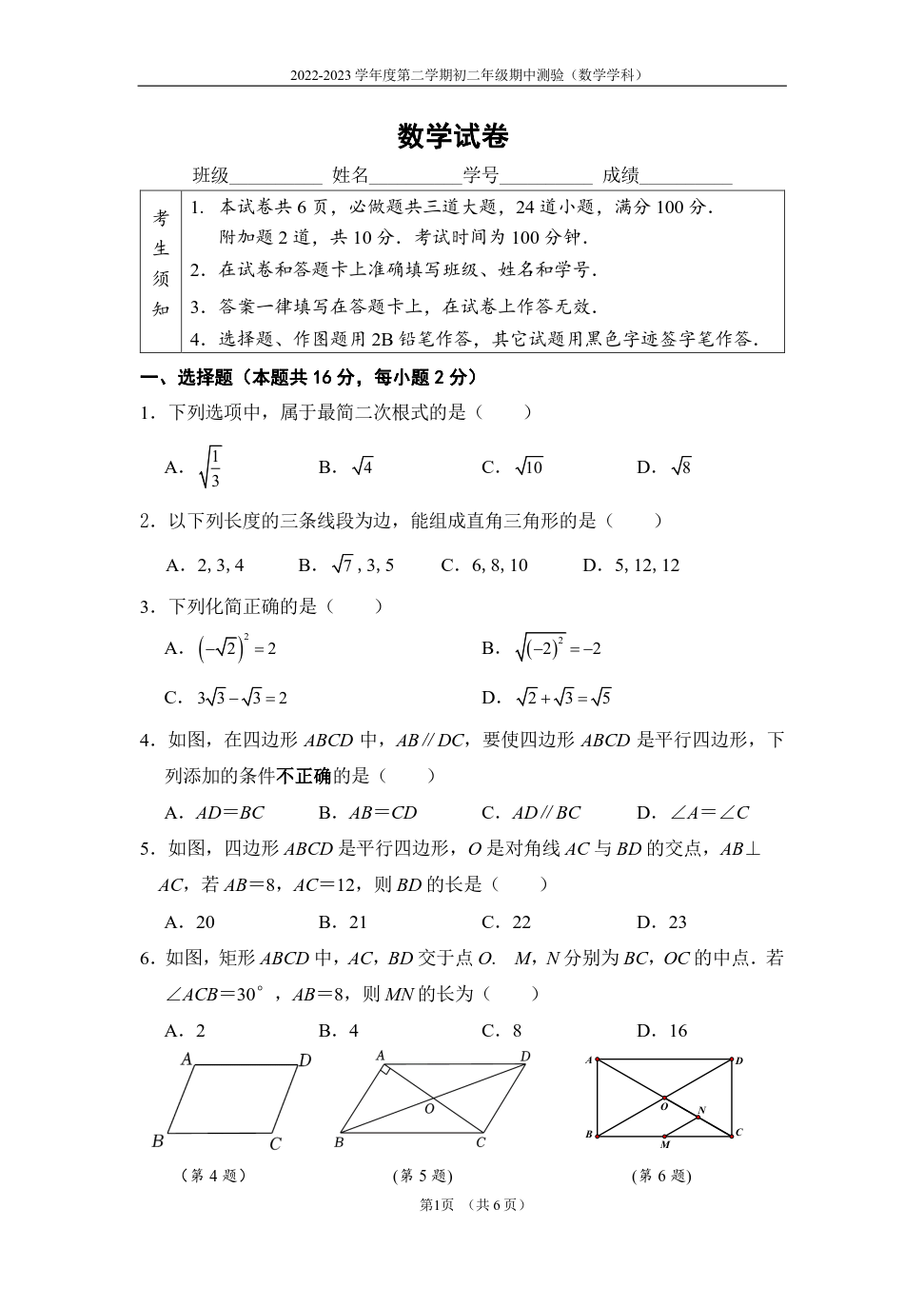 2023北京各区初二下期中试卷&答案汇总电子版,可加微信进群免费获取