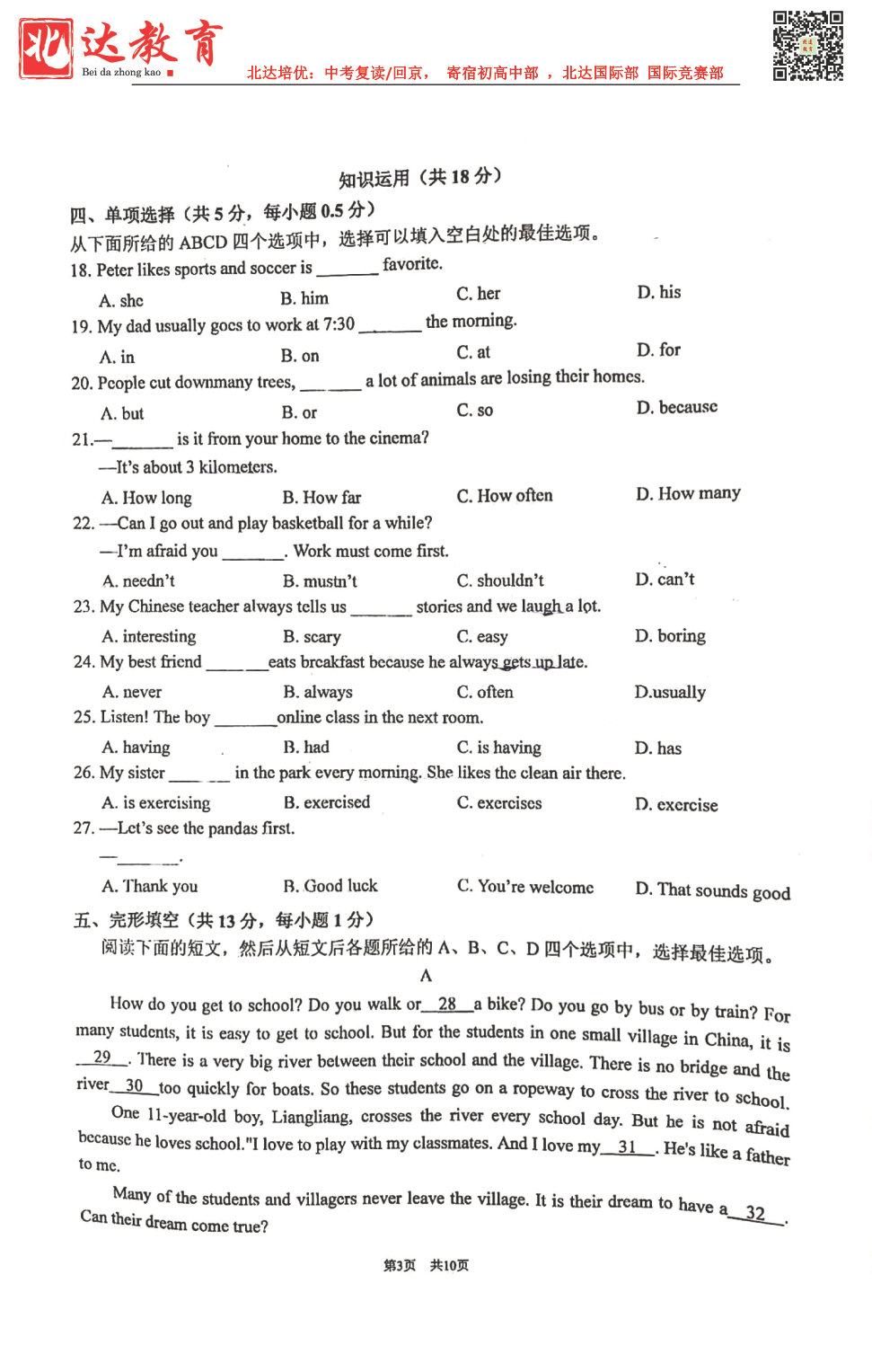 2023学年北京人大附中初一英语期中考考试已结束,admw360中考网为大家整理了试题及答案,分享给大家。