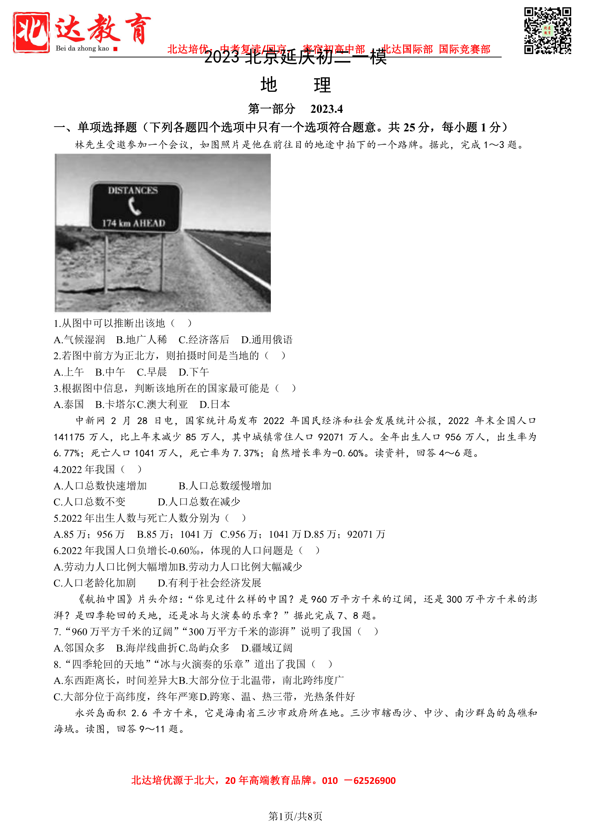 首页 初二试题 2023北京延庆区初二一模地理试题及答案