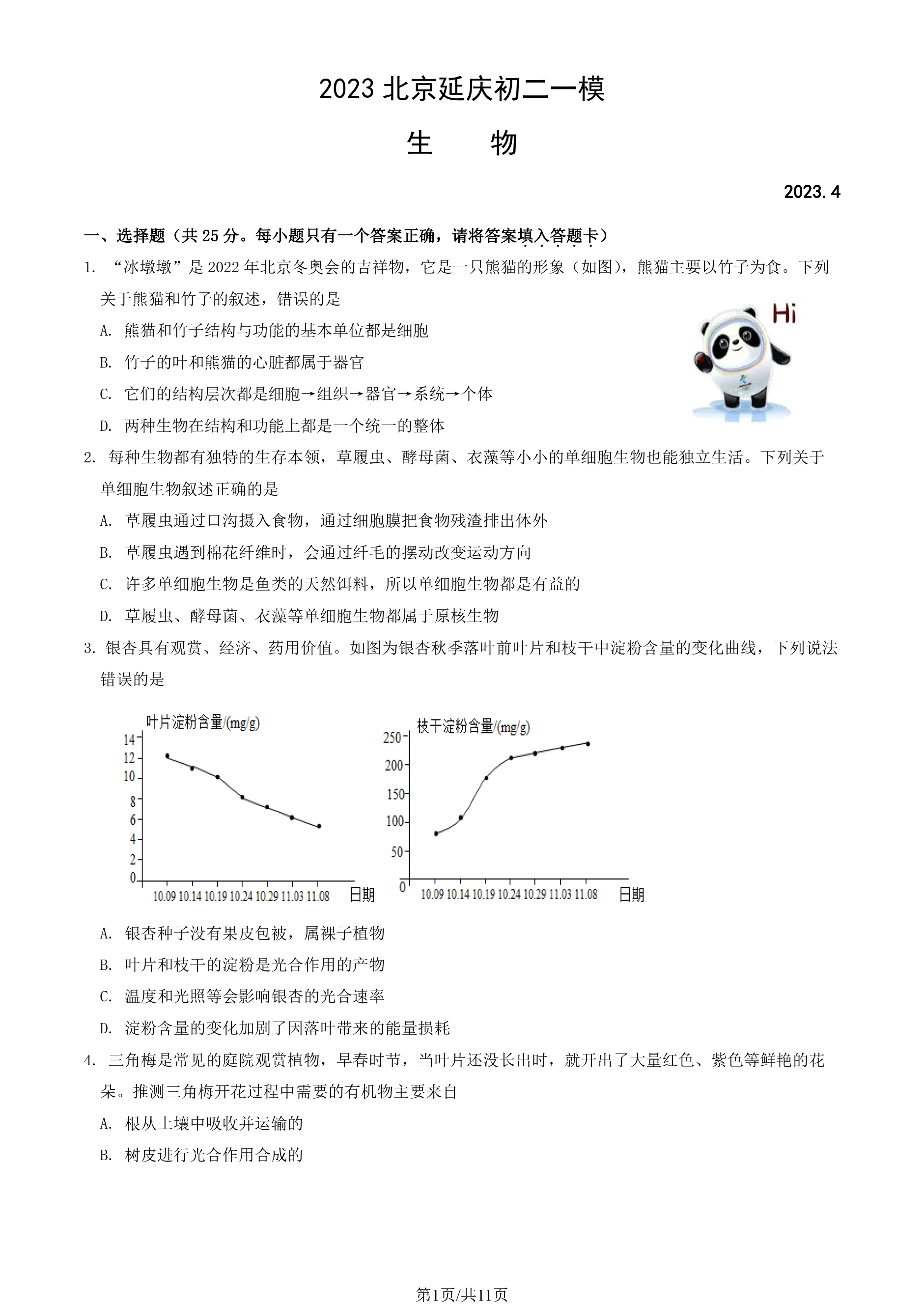 2023北京延庆区初二一模生物考已结束,admw360中考网为大家整理了 试题及答案,分享给大家。