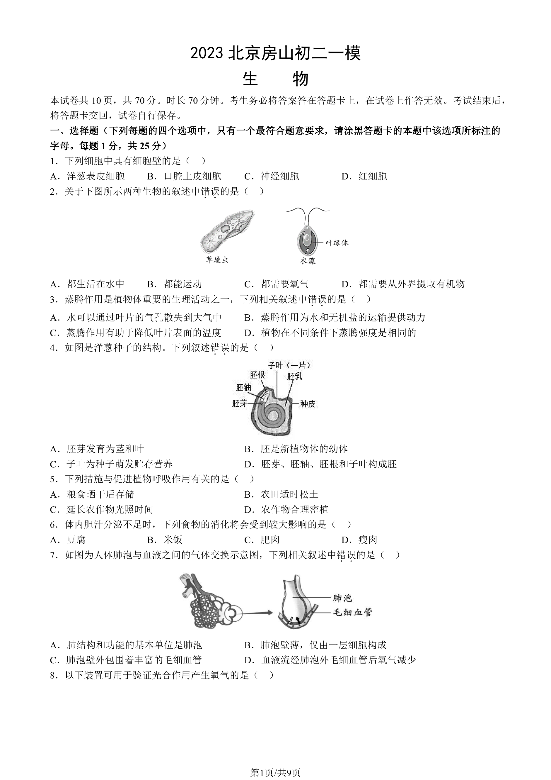 2023北京房山区初二一模生物考已结束,admw360中考网为大家整理了 试题及答案,分享给大家。