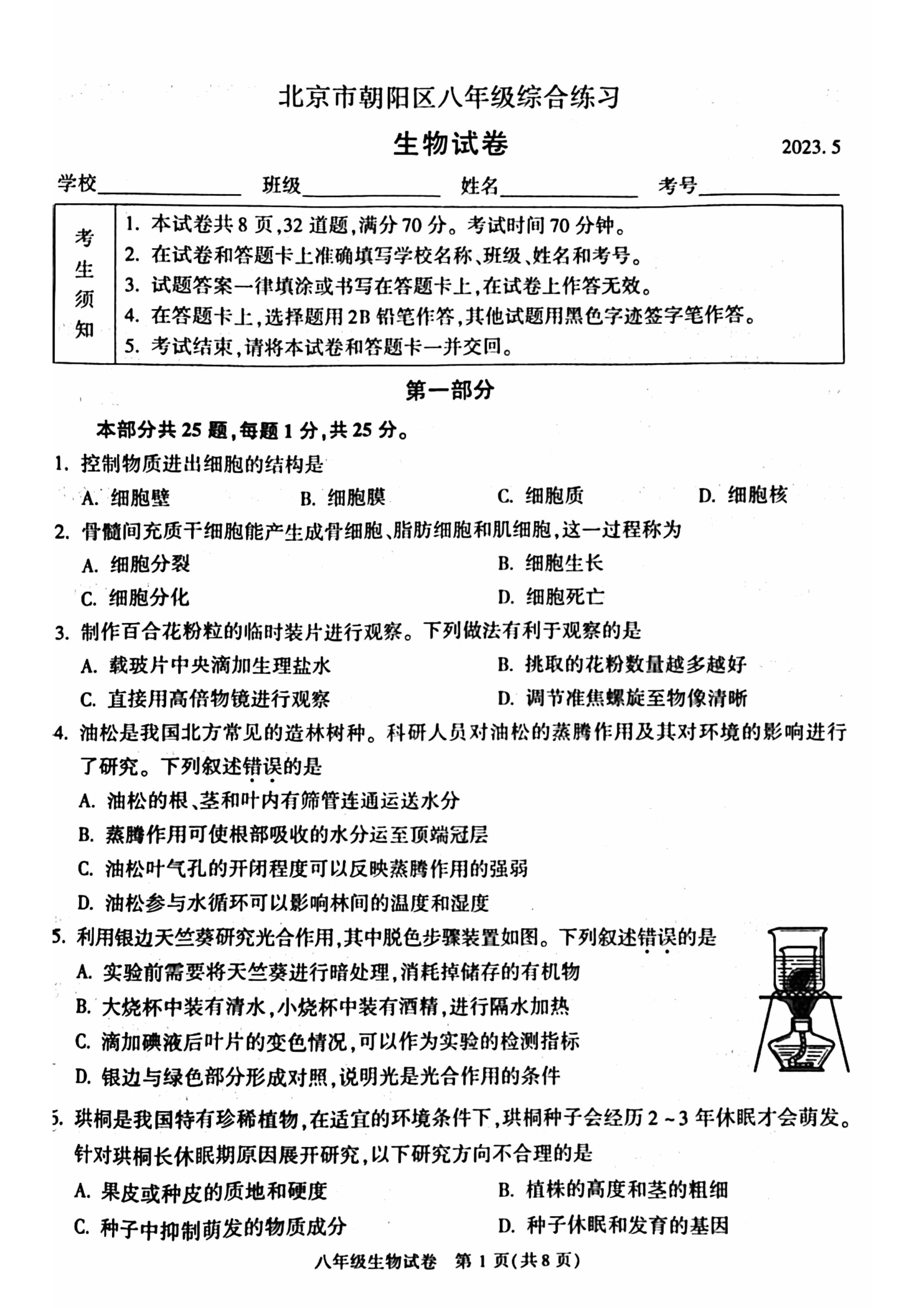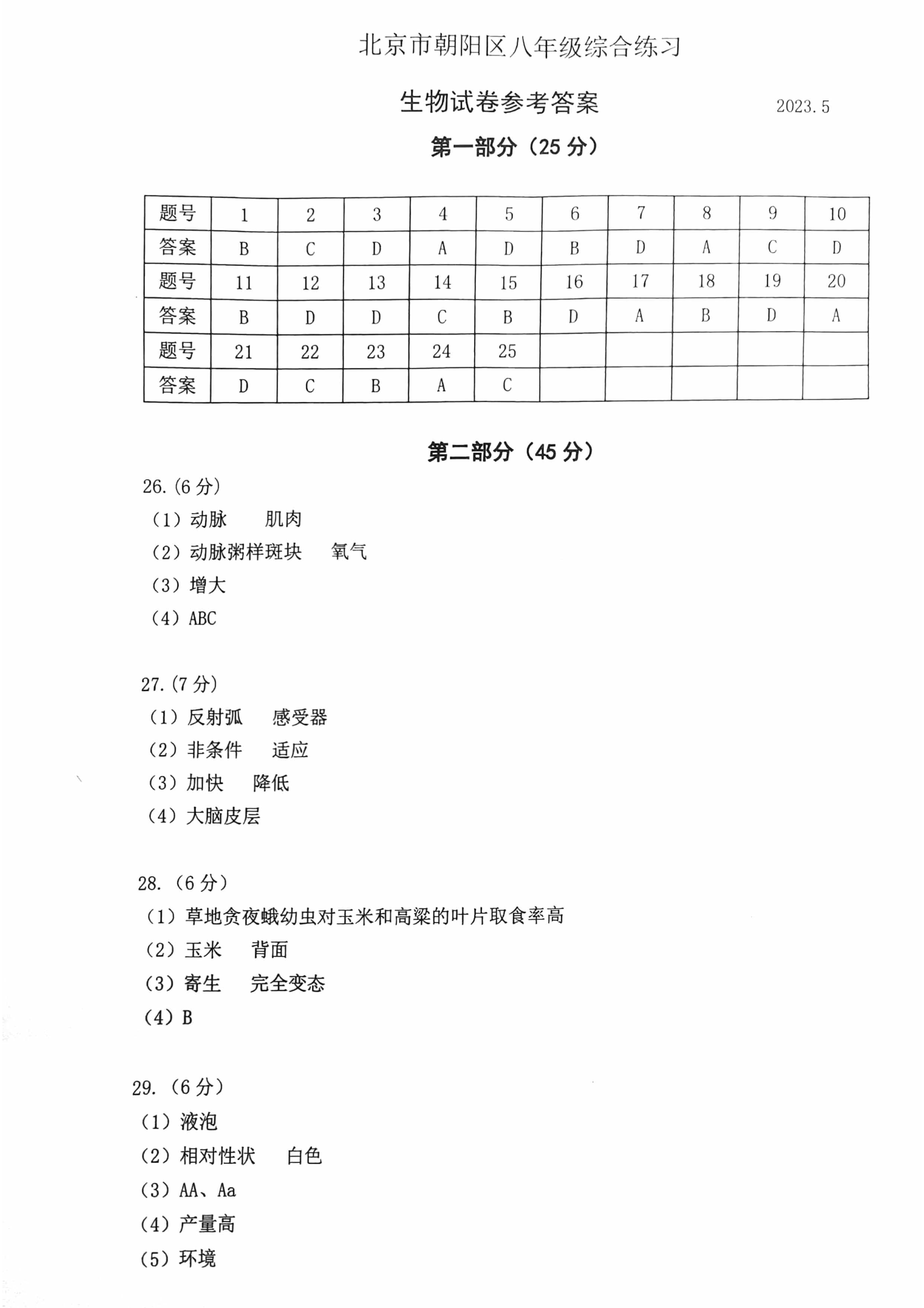 2023北京朝阳区初二一模生物考已结束,admw360中考网为大家整理了 试题及答案,分享给大家。