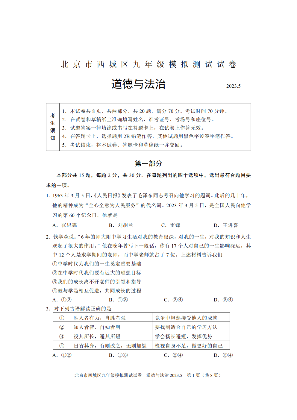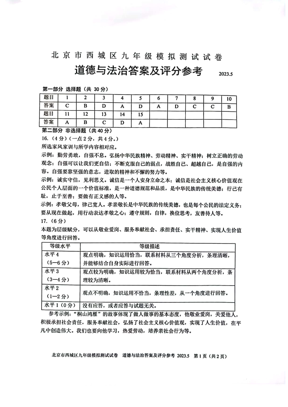 2023北京西城区初三二模正在进行,admw360中考网为大家整理了道法试题及答案,分享给大家。