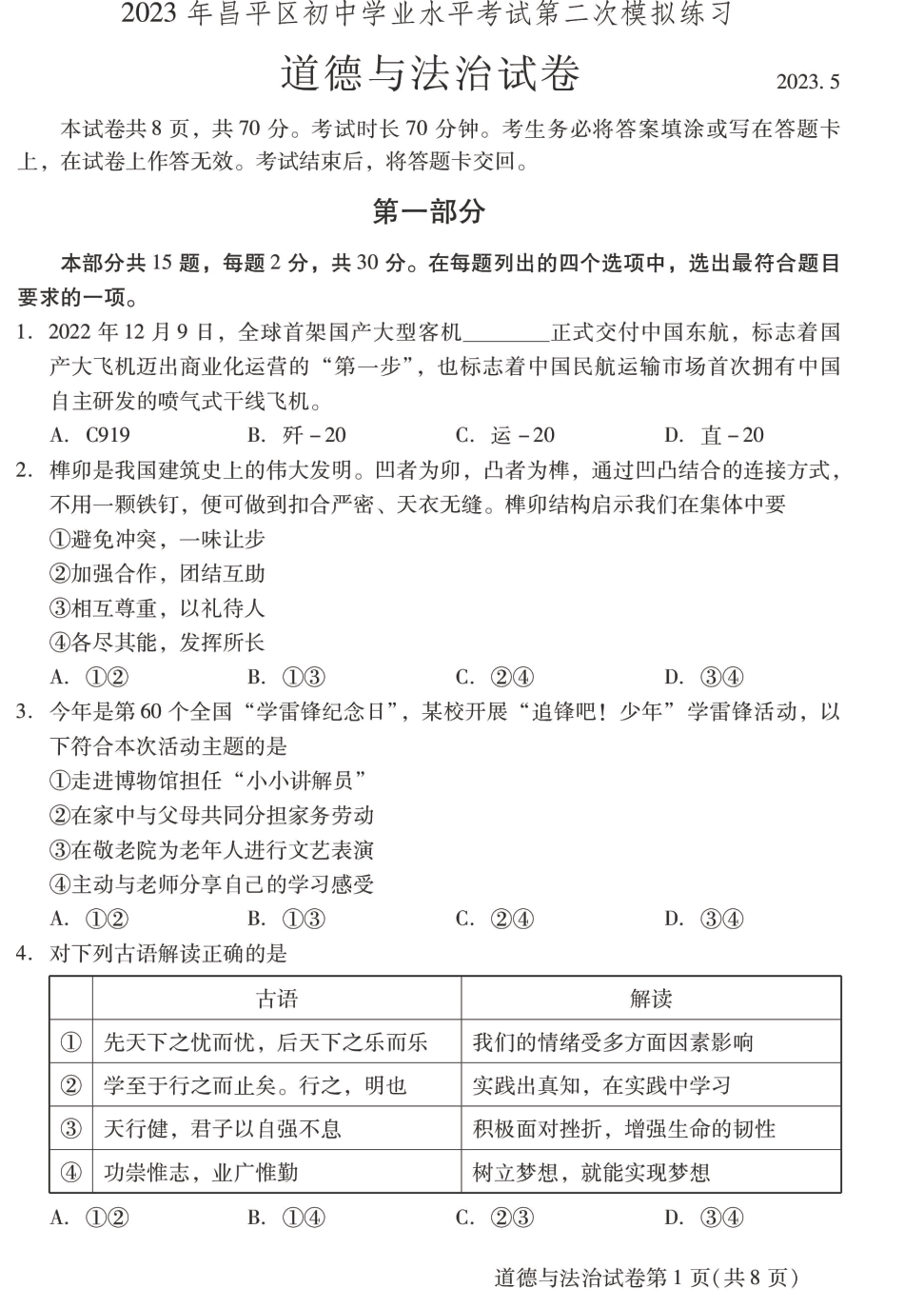 2023北京昌平区初三二模正在进行,admw360中考网为大家整理了道法试题及答案,分享给大家。