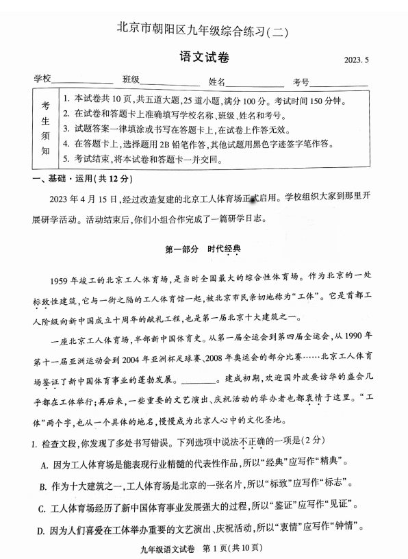2023北京朝阳区初三二模正在进行,admw360中考网为大家整理了语文试题及答案,分享给大家。