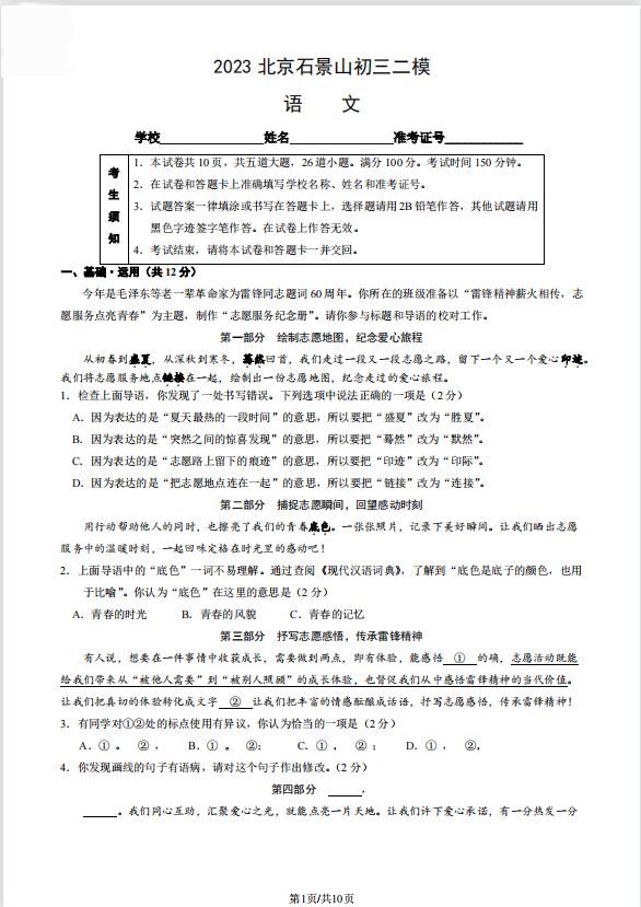 2023北京石景山区初三二模正在进行,admw360中考网为大家整理了语文试题及答案,分享给大家。