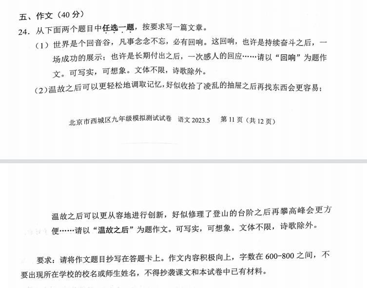 2023年北京初三二模西城区语文作文题出了,作文题目有两道。admw360中考网持续收集各区试卷内容供大家参考!