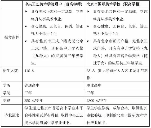 报考条件:①具有美术兴趣和一定基础,立志终身从事美术事业;②身心健康,无色盲、色弱,矫正视力不低于 1.0;③具有北京市正式户籍或无北京正式户籍,具有高中升学资格(九种人)的应届初三年级学生。