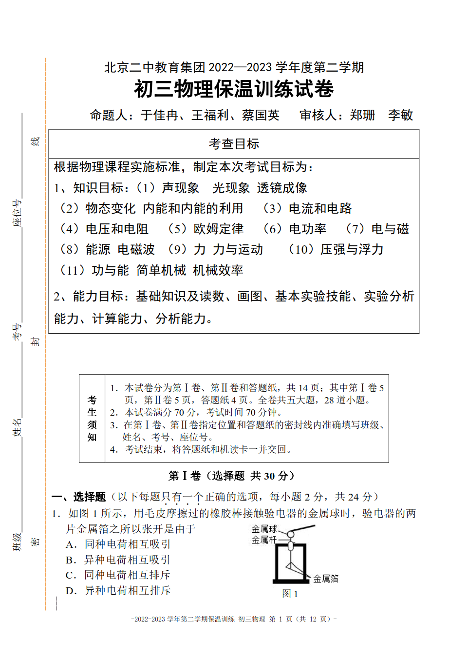 admw360中考网整理了2023北京二中初三三模保温训卷物理试题及答案,考生和家长可自行下载!
