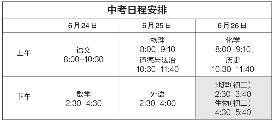 初三年级考生将在24日至26日上午,参加语文、数学、物理、道德与法治、外语、化学、历史科目考试;初二年级考生于26日下午参加地理和生物科目考试。每科开考前30分钟,考生开始进入考场。