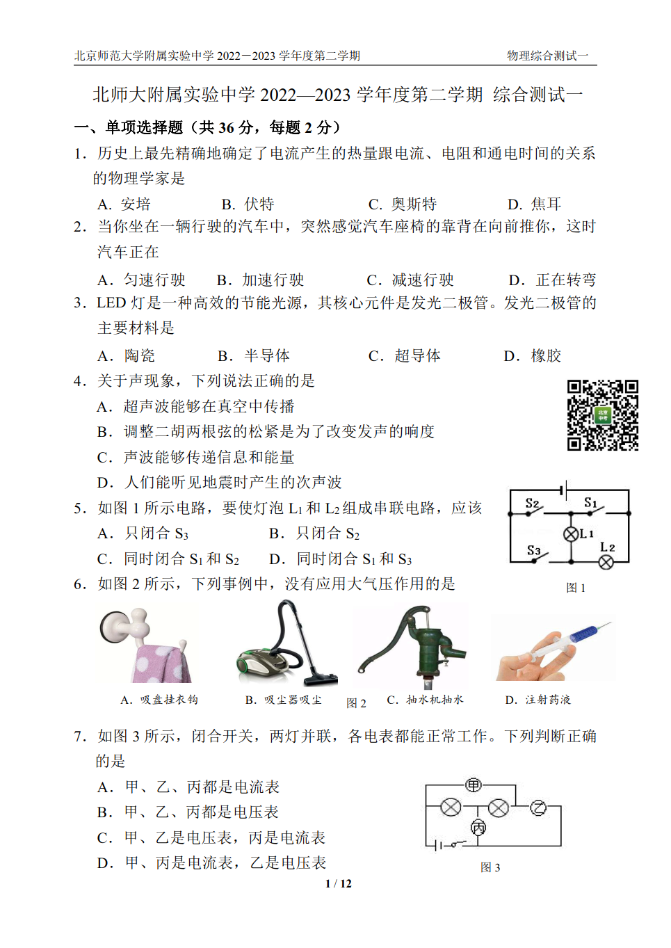 admw360中考网整理了2023北师大实验初三三模物理试卷及答案,考生和家长可自行下载!