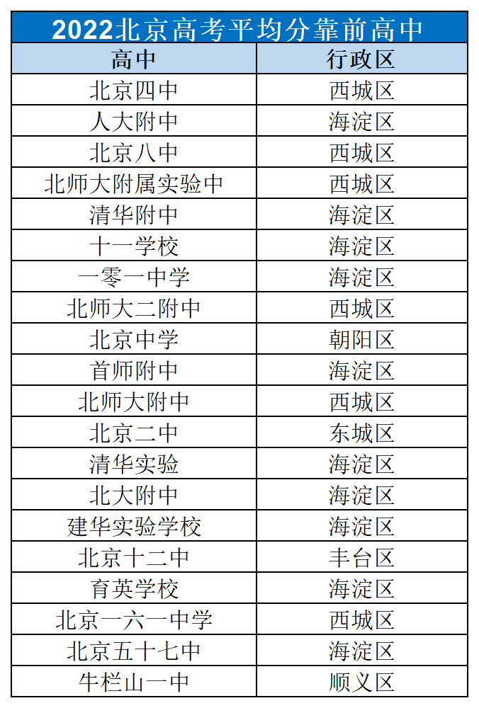 在2021年至2022年北京高考平均分前20的学校中,总体来看位次变化不大,北京四中稳居榜首!人大附中位居第二!清华附中跌落前三!北师大附属实验中学位列第四,值得一提的是牛栏山一中,育英中学位居靠后孑然冲进前二十!人大附中作为竞赛强校,优质师资生源可谓非常可观,北京四中却位居榜首,可见实力强悍。牛栏山一中位次提升猛进,位次的提升离不开优秀的生源与师资,实在潜力股。北京中学上升明显突破进前十,北京二中出乎意料跌出前十!首师附中从位列第六退居第十,人大附中朝阳学校退出前20!前20排名学校主要分布于海淀,西城,朝阳区,优质高中主要聚集地,部分学校分布于丰台,东城,顺义,石景山区。