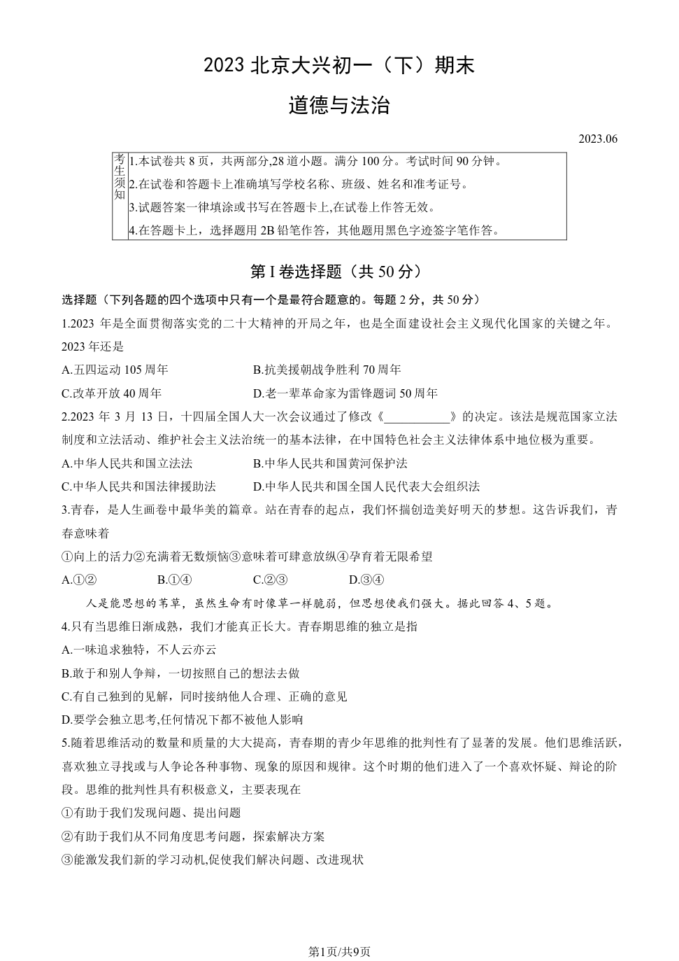 首页 初一试题 2023北京大兴区初一(下)期末道法试题及答案