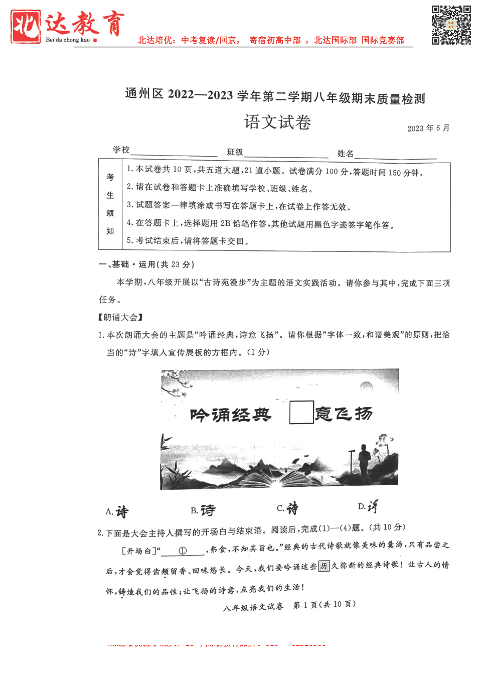 2023北京各区初二期末考已陆续开始,admw360中考网为大家整理了 试题及答案,分享给大家。