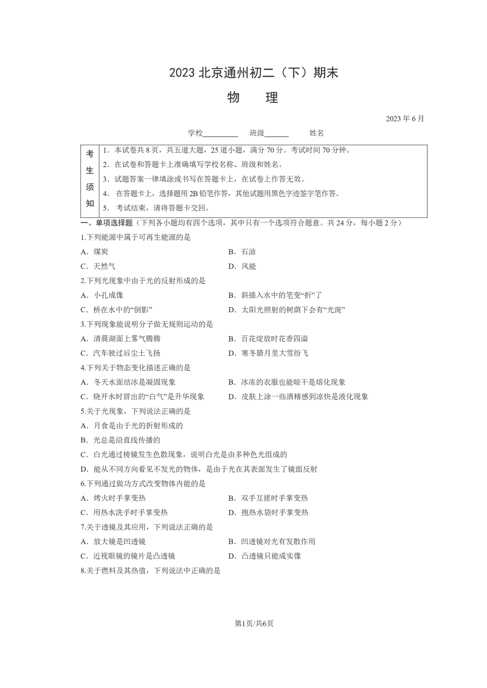 首页 初二试题 2023北京通州区初二(下)期末物理试题及答案