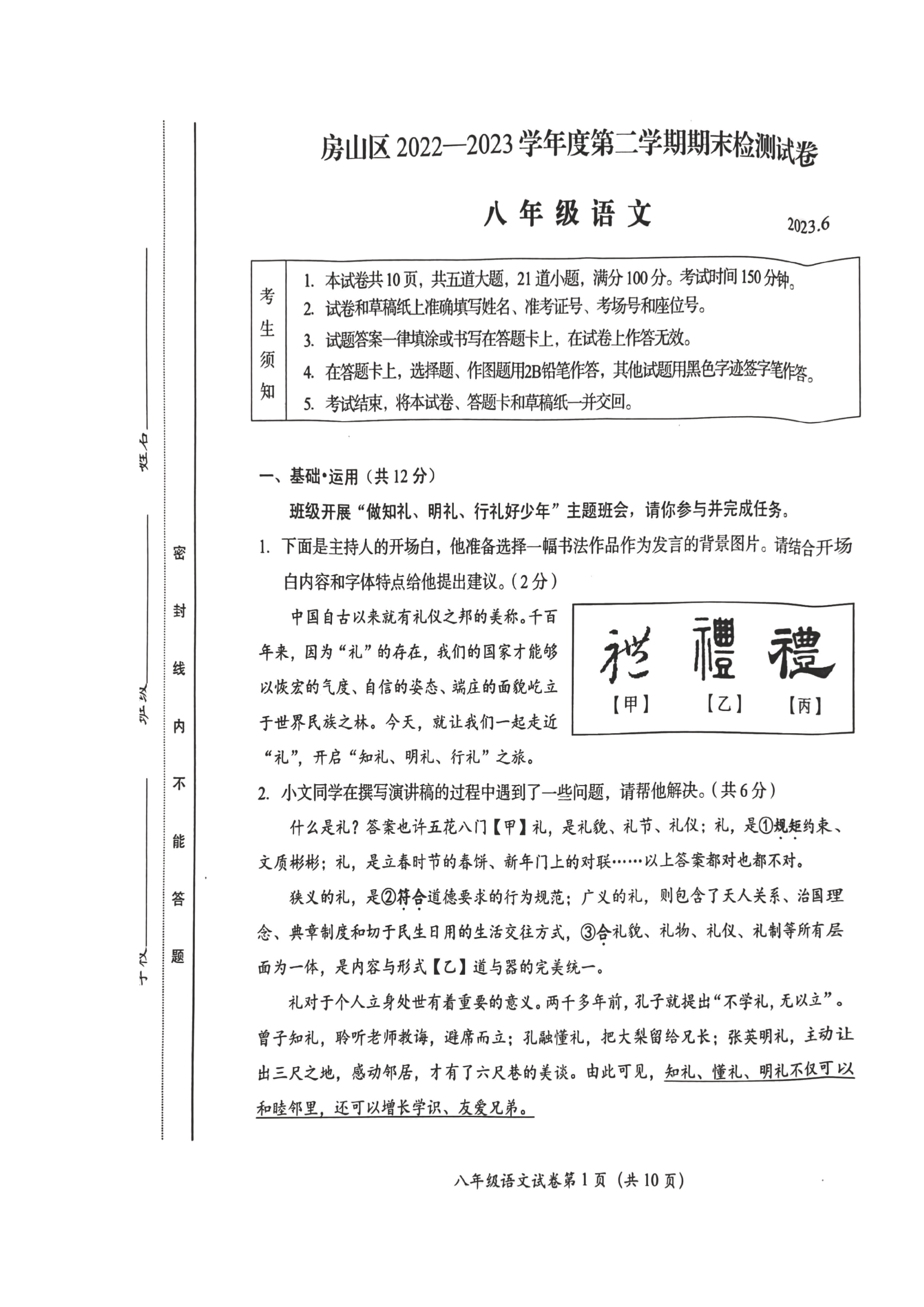 2023北京房山区初二(下)期末语文试题及答案