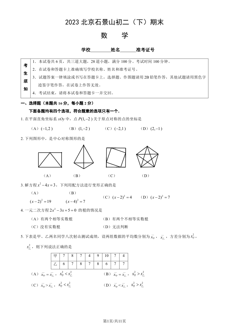 首页 初二试题 2023北京石景山区初二(下)期末数学试题及答案