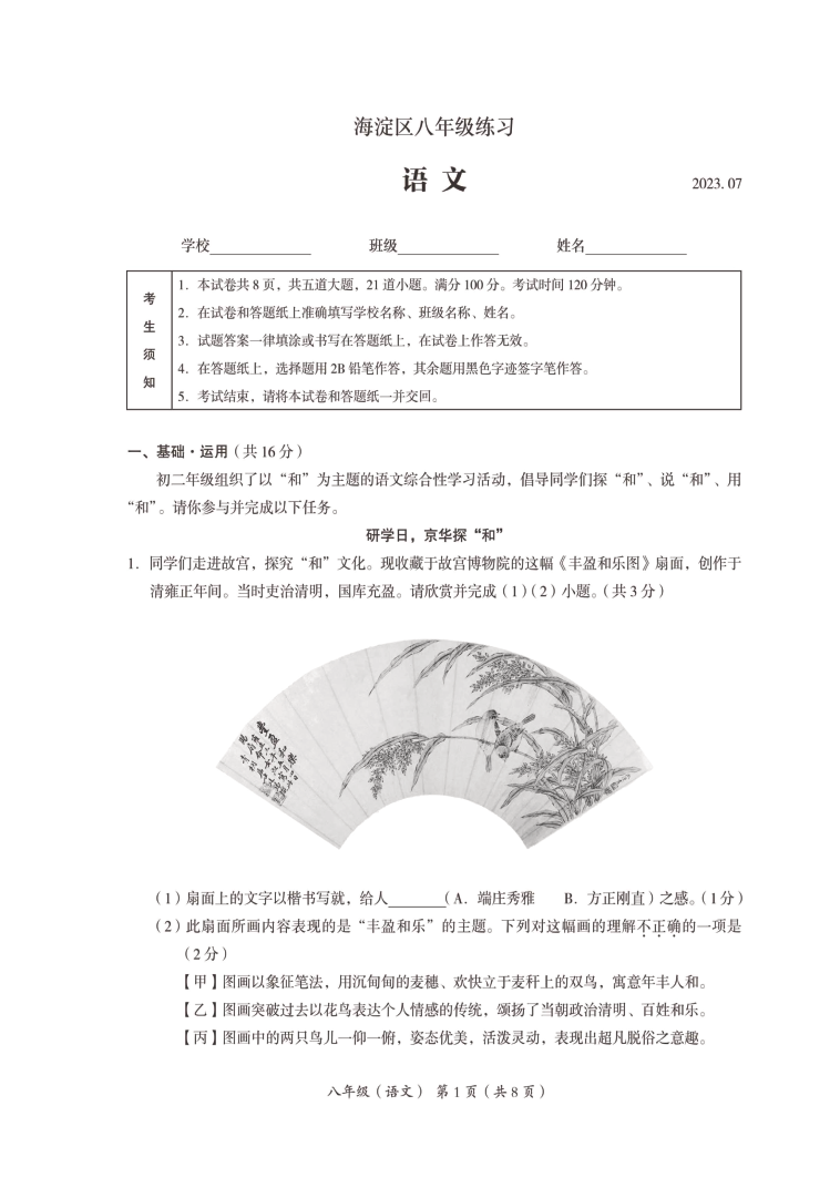 2023北京北京海淀区初二(下)期末语文试题及答案