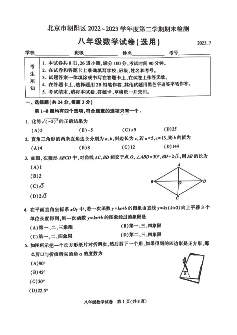 2023北京朝阳区初二(下)期末数学试题及答案