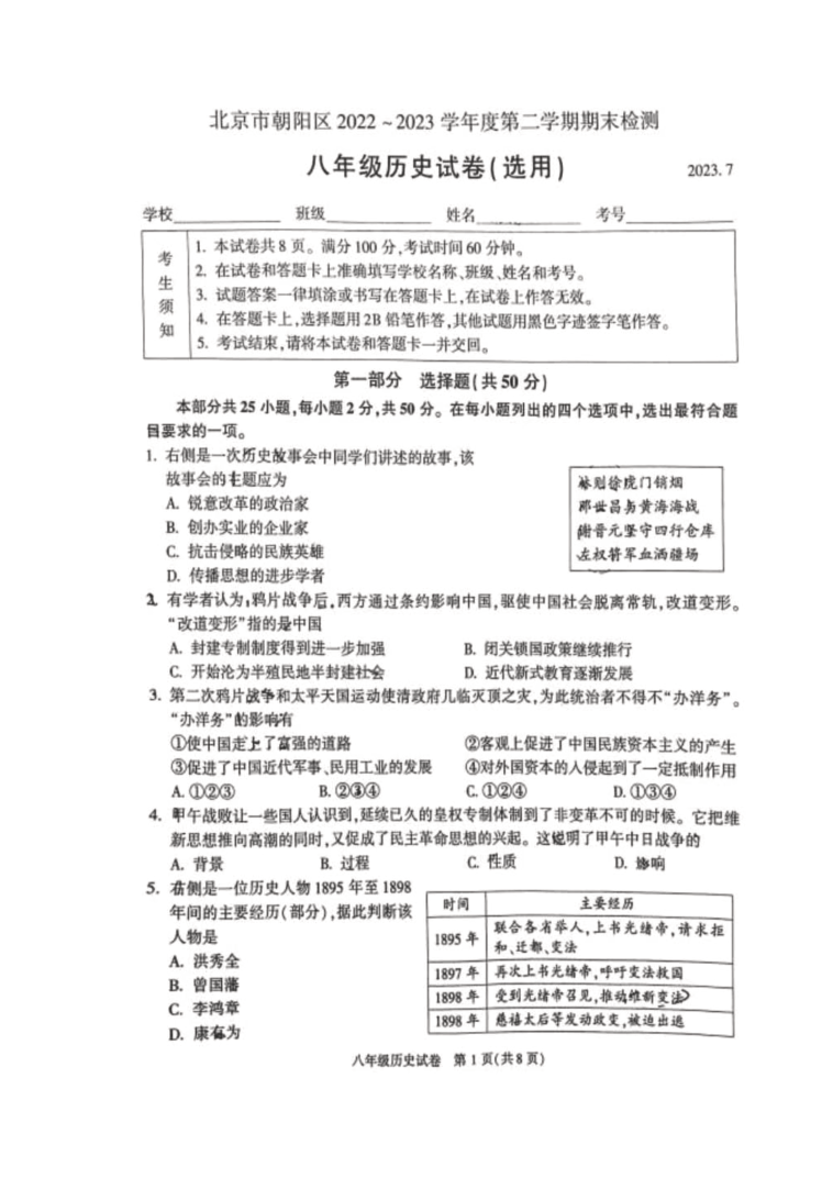首页 初二试题 2023北京朝阳区初二(下)期末历史试题及答案