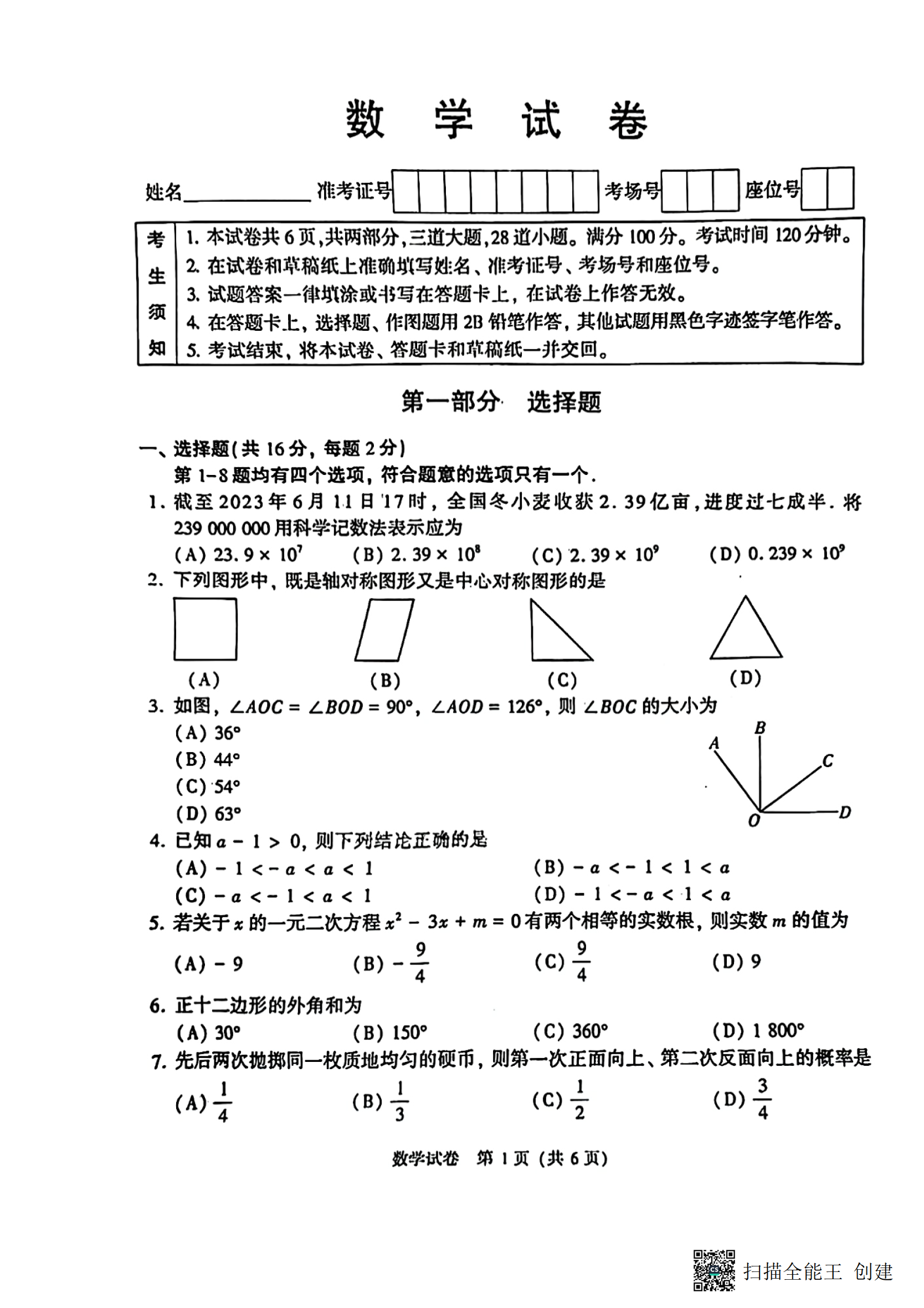 admw360中考网为大家整理累2023北京中考数学真题及答案,需要的同学可自行下载练习。