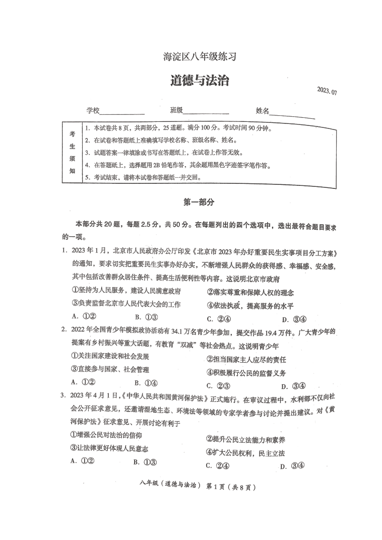 2023北京海淀区初二(下)期末道法试题及答案