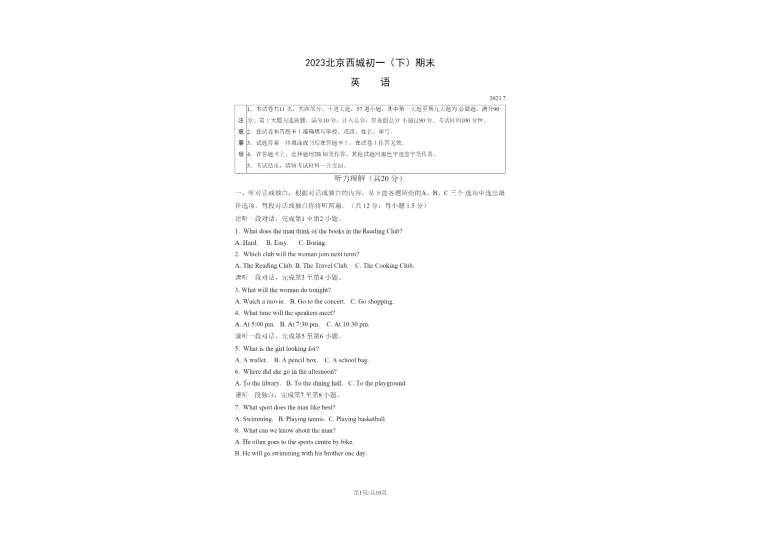 首页 初一试题 2023北京西城区初一(下)期末英语试题及答案