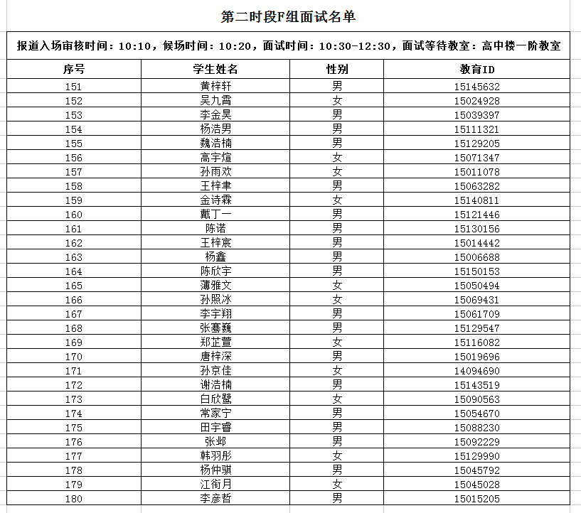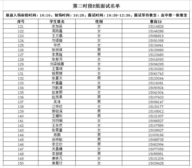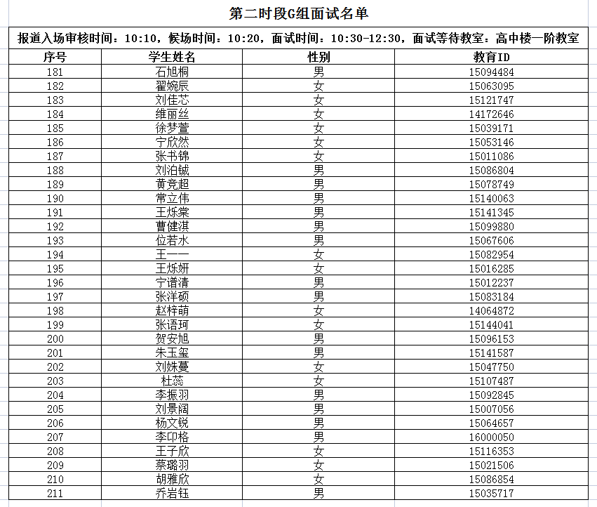 第二时段:E-G组报道入场审核时间:10:10,面试开始时间:10:30, 面试结束时间:12:30