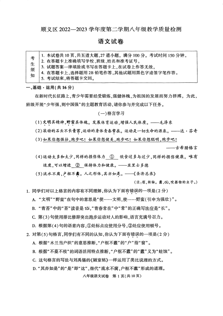 首页 初二试题 2023北京顺义区初二(下)下期末语文试题及答案