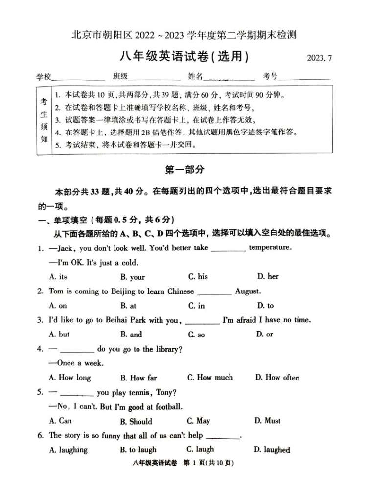 首页 初二试题 2023北京朝阳区初二(下)期末英语试题及答案