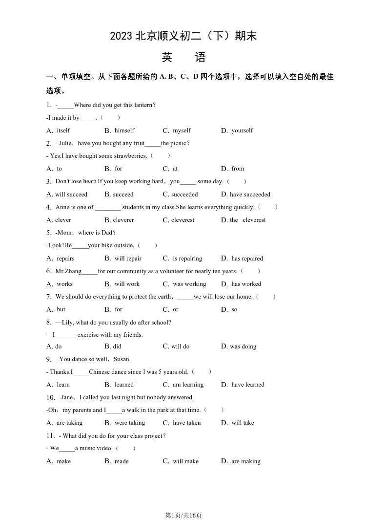 首页 初二试题 2023北京顺义区初二(下)期末英语试题及答案