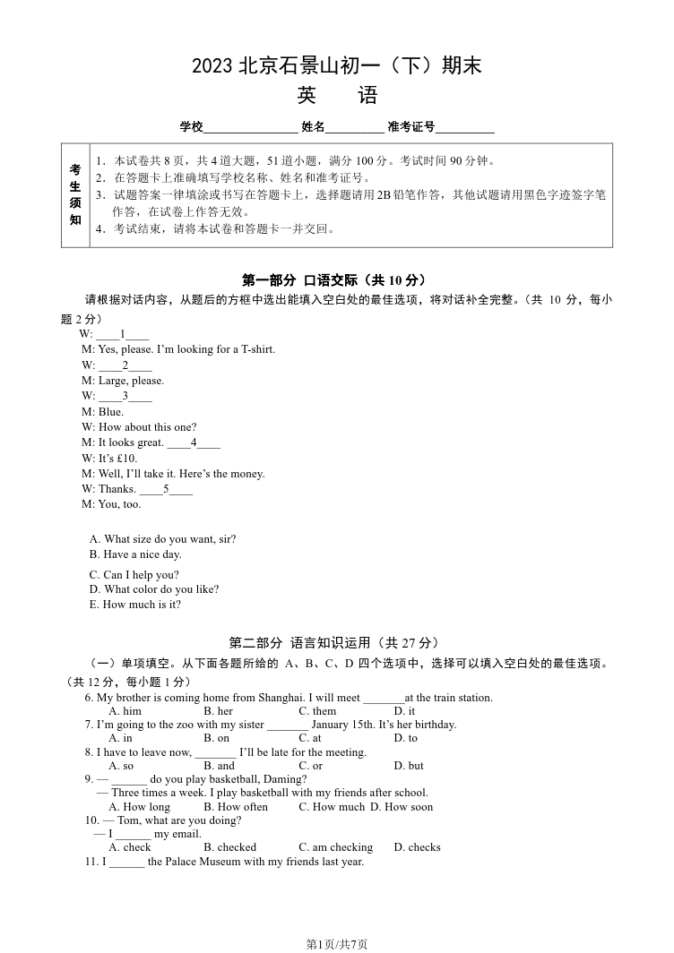 首页 初一试题 2023北京石景山区初一(下)期末英语试题及答案