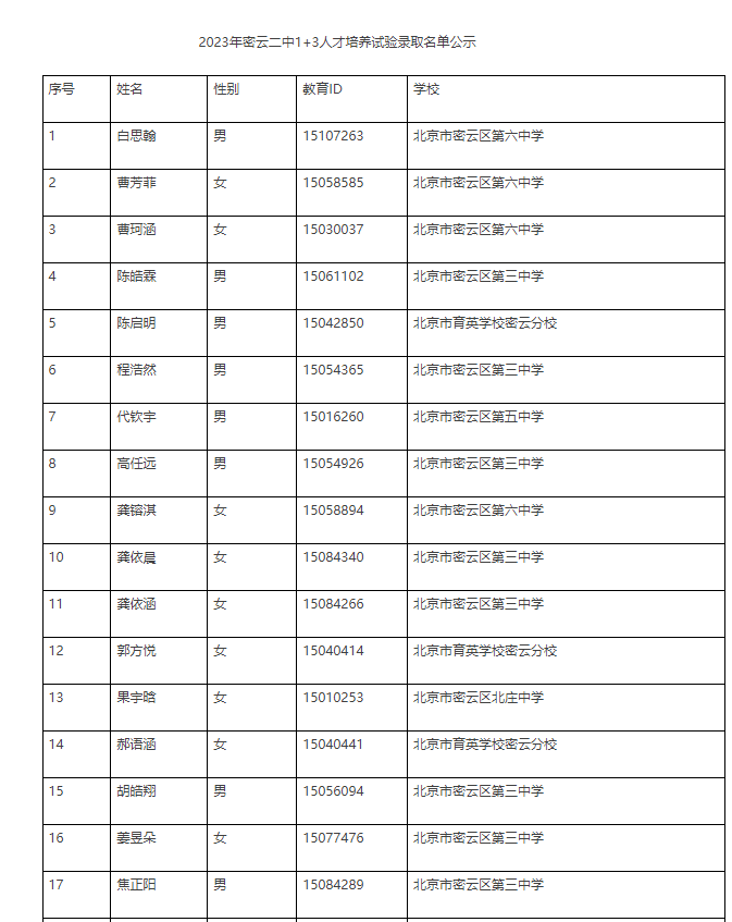 2023北京密云二中1+3项目录取名单发布!admw360中考网为大家整理名单详情,分享给大家。