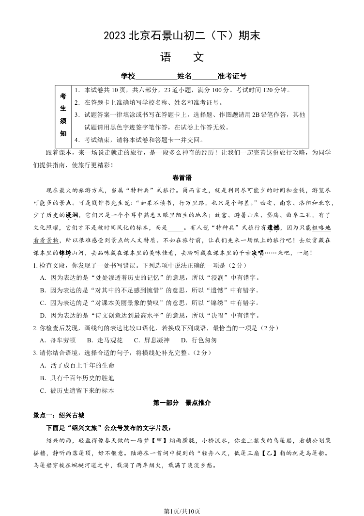 首页 初二试题 2023北京石景山区初二下期末语文试题及答案