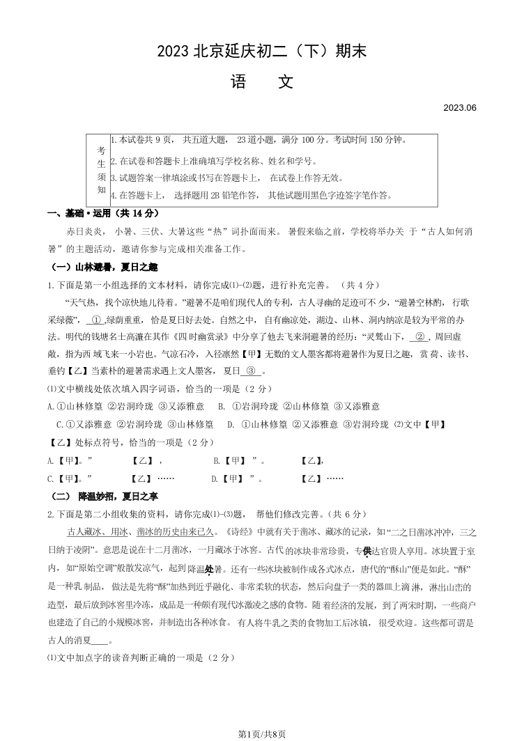 2023北京延庆区初二(下)期末语文试题及答案