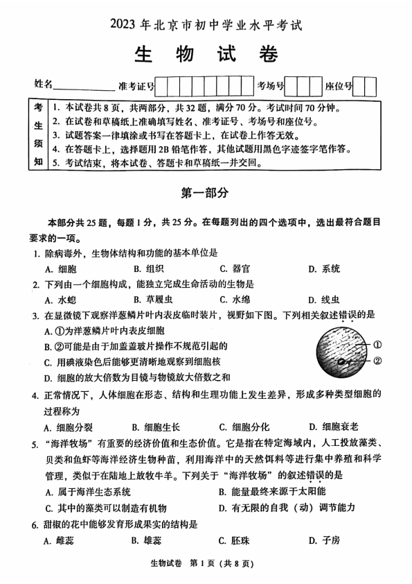 admw360中考网为大家整理了2023年北京小中考生物真题及答案,需要的同学可自行下载练习。