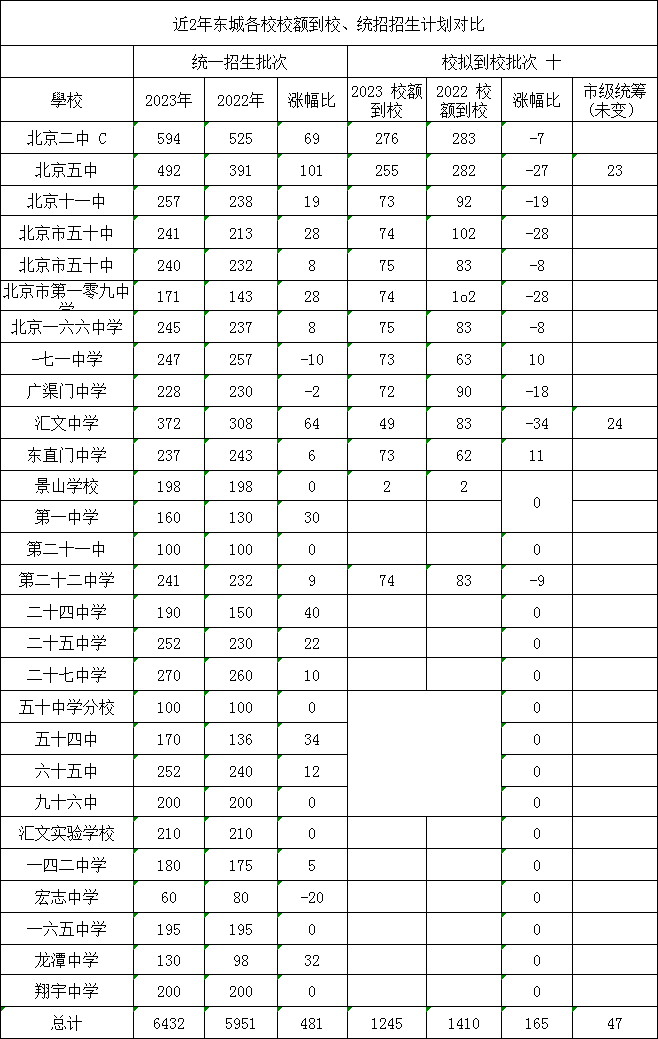 ②2023东城统招批次有28所学校招生6432人,较去年扩招481人,其中17所高中扩招;一七一中学、广渠门中学、东直门中学、宏志中学4校统招计划小幅缩减。