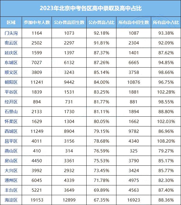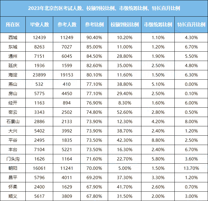 admw360中考网整理了2023年北京各区考试人数、校额到校比例、市级统筹比例、特长直升比例数据。对于我们24、25年中考的孩子们都是很有参考价值的。