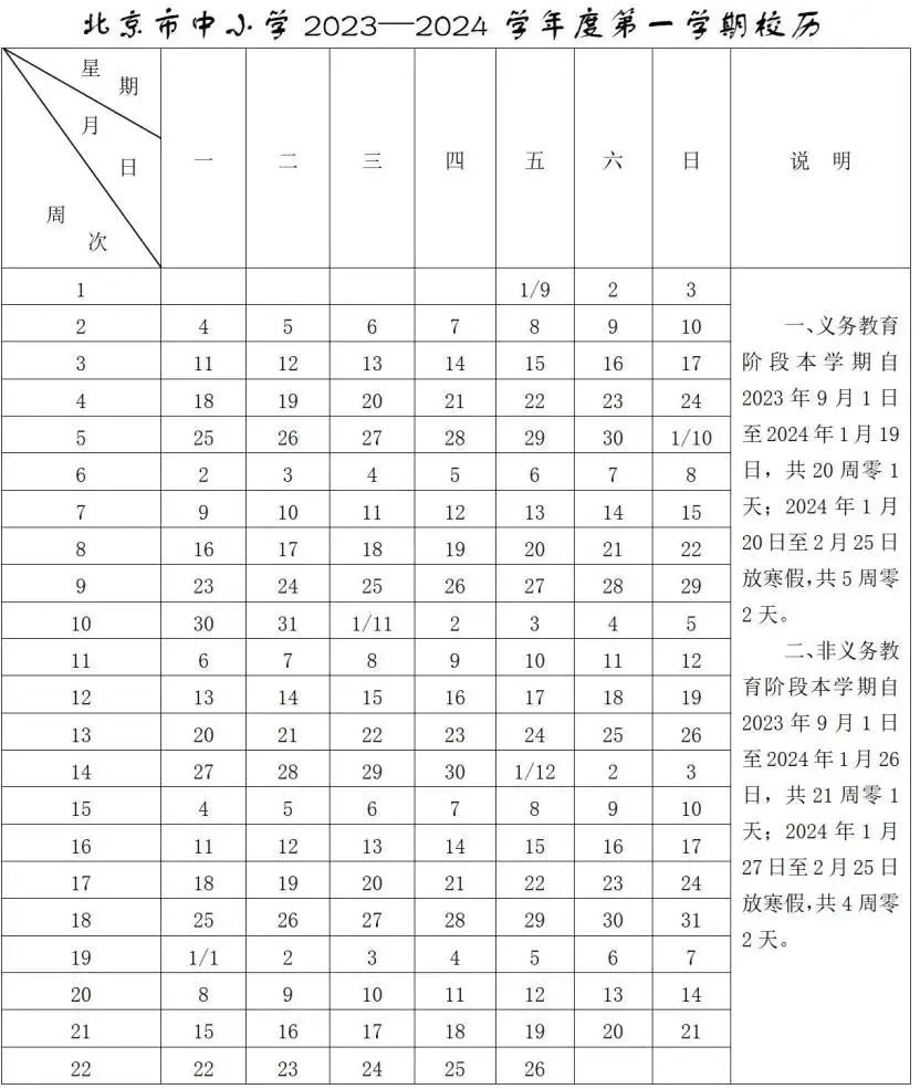 近日北京市教委公布了2023-2024学年各级各类学校校历,一学期时间为9月1日(星期五)至2024年1月26日(星期五)共21周零1天。一起来看详细内容~