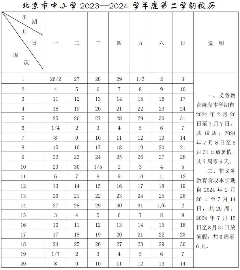 北京市中小学2023-2024学年校历
